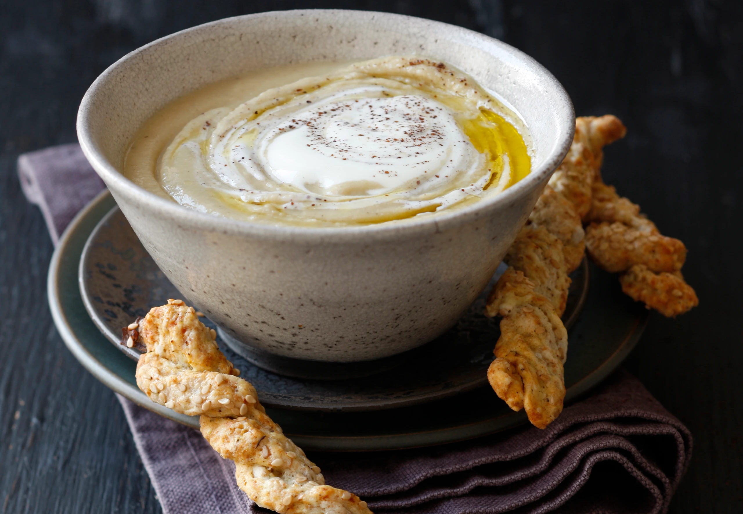 - Rosmarin aus der Suppe entfernen, Suppe pürieren, mit Salz, Pfeffer und übrigem Zahtar würzen. Suppe anrichten, mit Joghurt, Sumac und Olivenöl garnieren, mit Sesamzöpfen servieren.