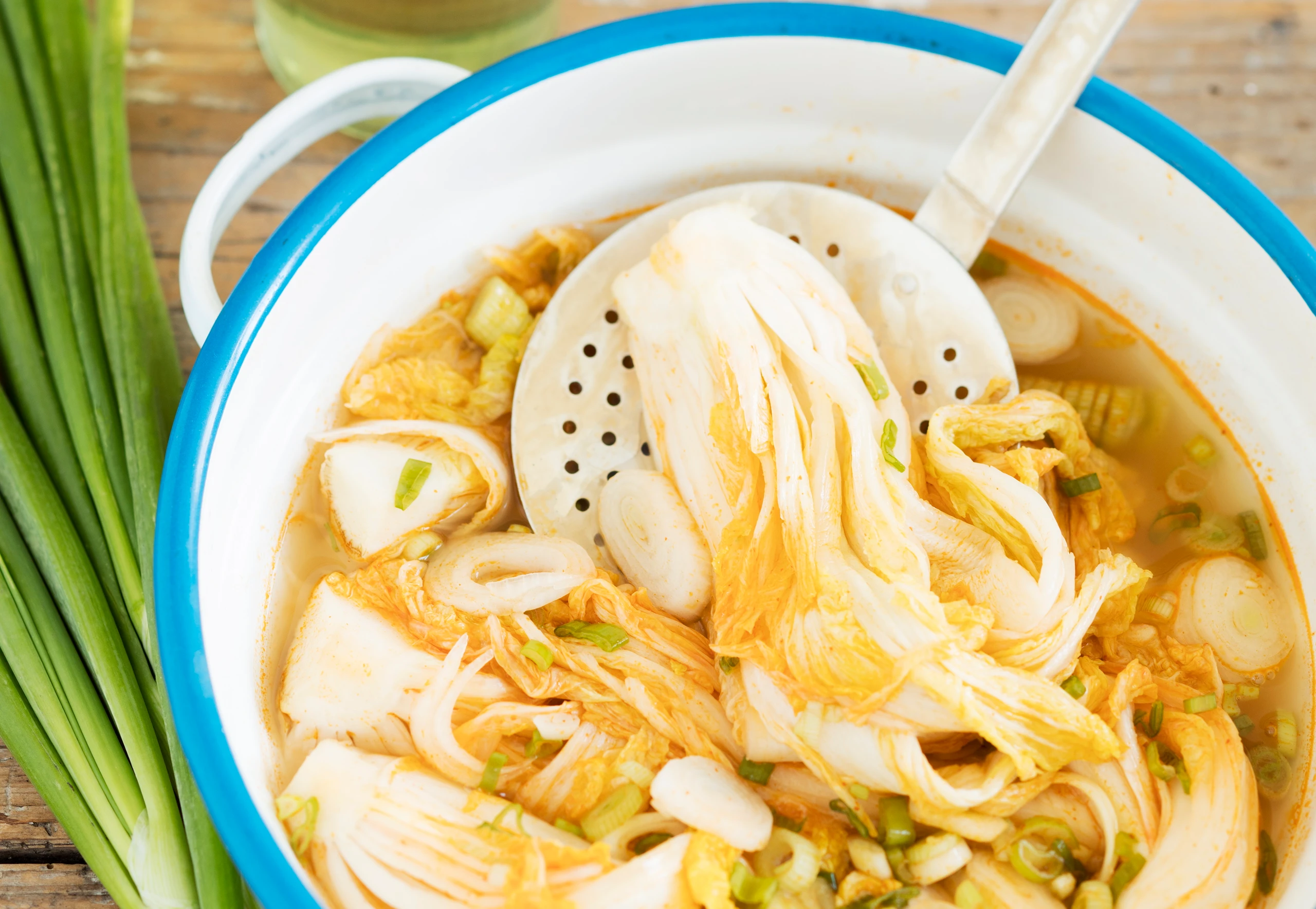 Kimchi in ein Einmachglas füllen, gut festdrücken, es dürfen keine Lufteinschlüsse sein, an der Oberfläche sollte ca. 1 cm hoch Lake stehen. Gemüse beschweren, am einfachsten mit einem mit Wasser gefülltem Tiefkühlsackerl.