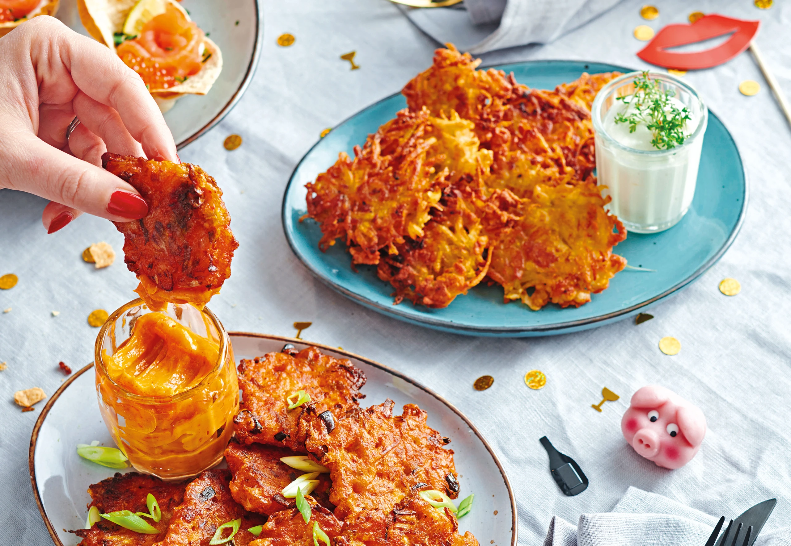 Pancakes mit Jungzwiebel bestreuen und mit der Mayonnaise servieren.