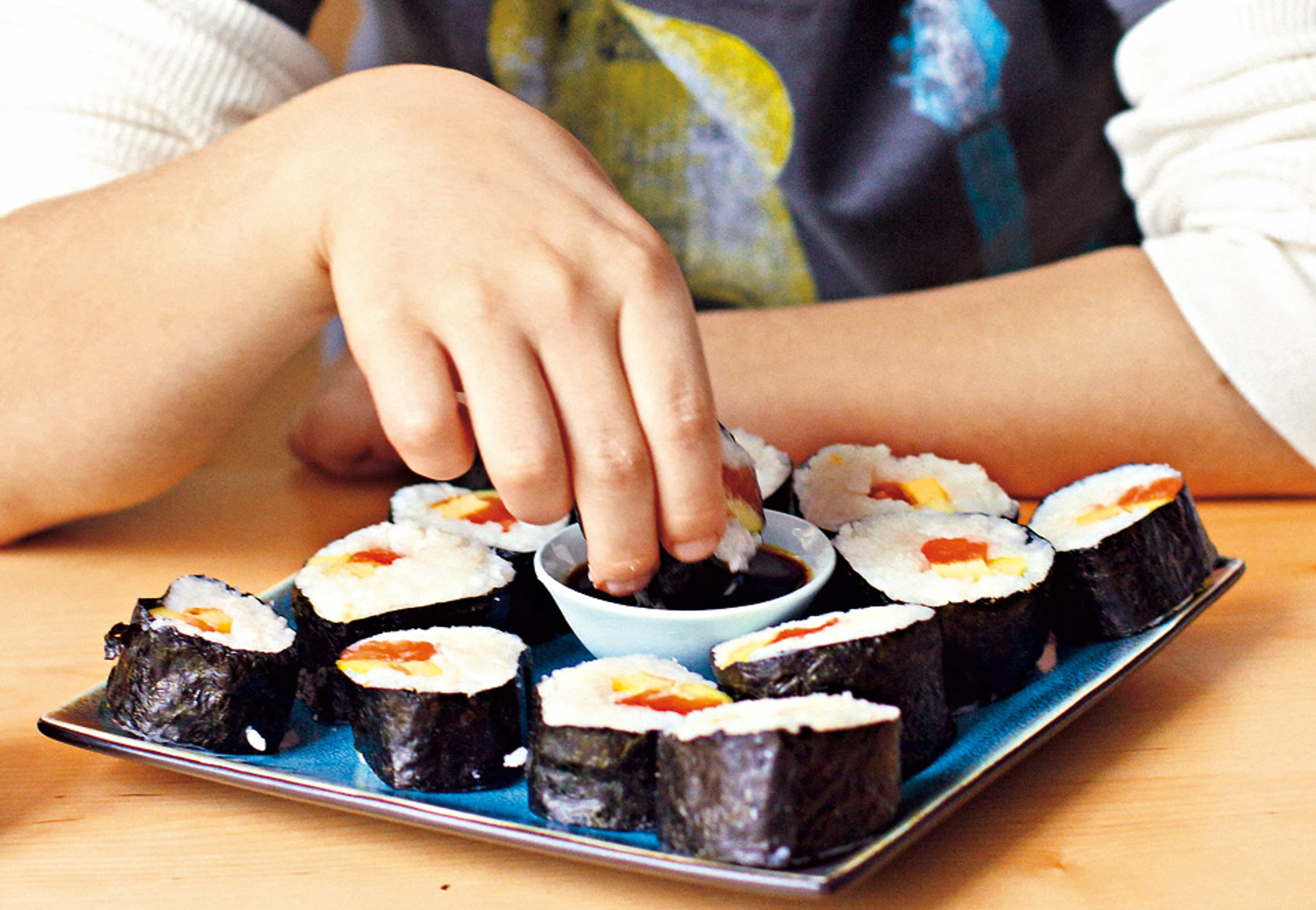Noriblatt auf eine Bambusmatte legen. Reis auf der Hälfte des Blattes verteilen (0,5 cm hoch), in die Mitte eine Rille drücken, je 1 Ei-, Lachs- und Gurkenstreifen hineinlegen. Noriblatt mit Hilfe der Bambusmatte fest einrollen. Vorgang mit den restlichen Blättern wiederholen. Rollen in ca. 3 cm breite Stücke schneiden.