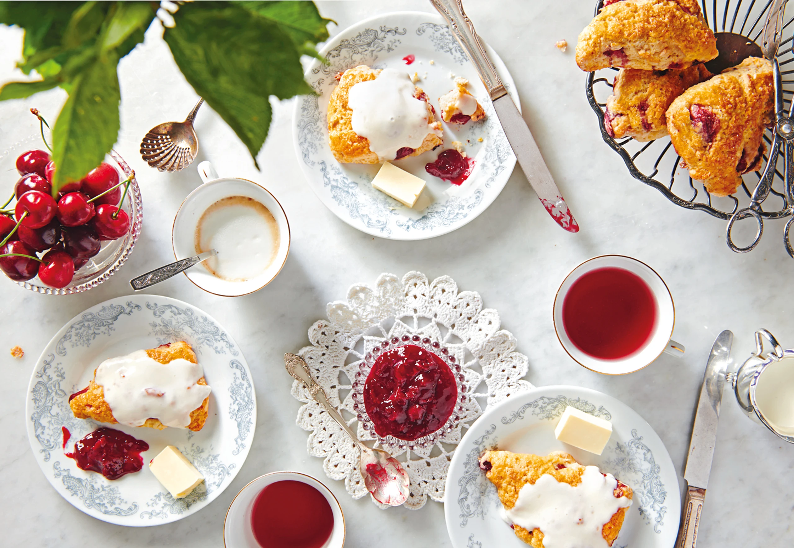 Für die Glasur Sauerrahm, Zucker und Zitronensaft glatt rühren. Auf den Scones verteilen. Dazu passen Kirschmarmelade und Butter.