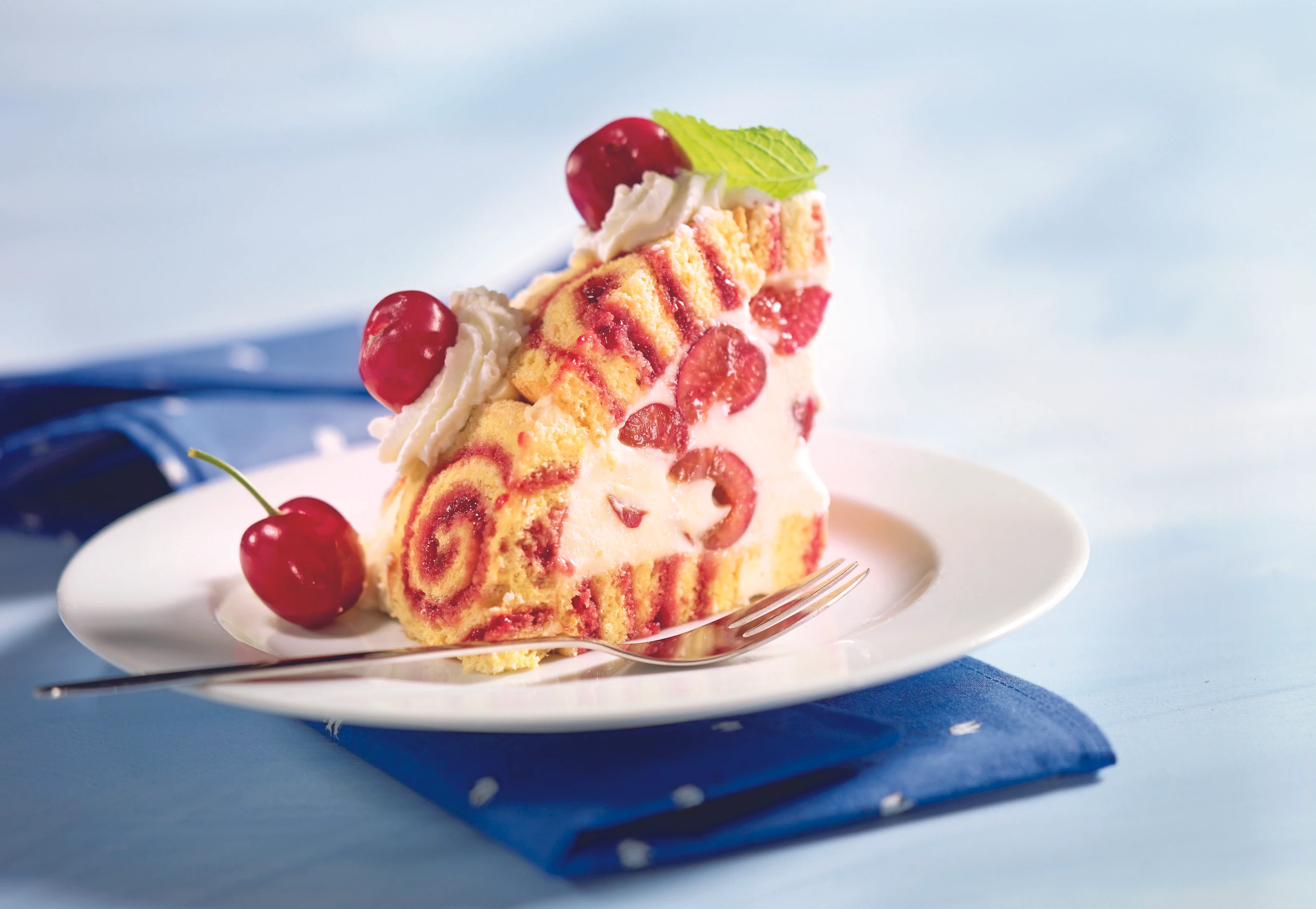 Eine Schüssel (Inhalt ca. 2 l) befeuchten und mit Frischhaltefolie auslegen. Biskuitroulade in 24 gleich dicke Scheiben schneiden. Schüssel mit 14 Biskuitscheiben auslegen und in den Kühlschrank stellen.