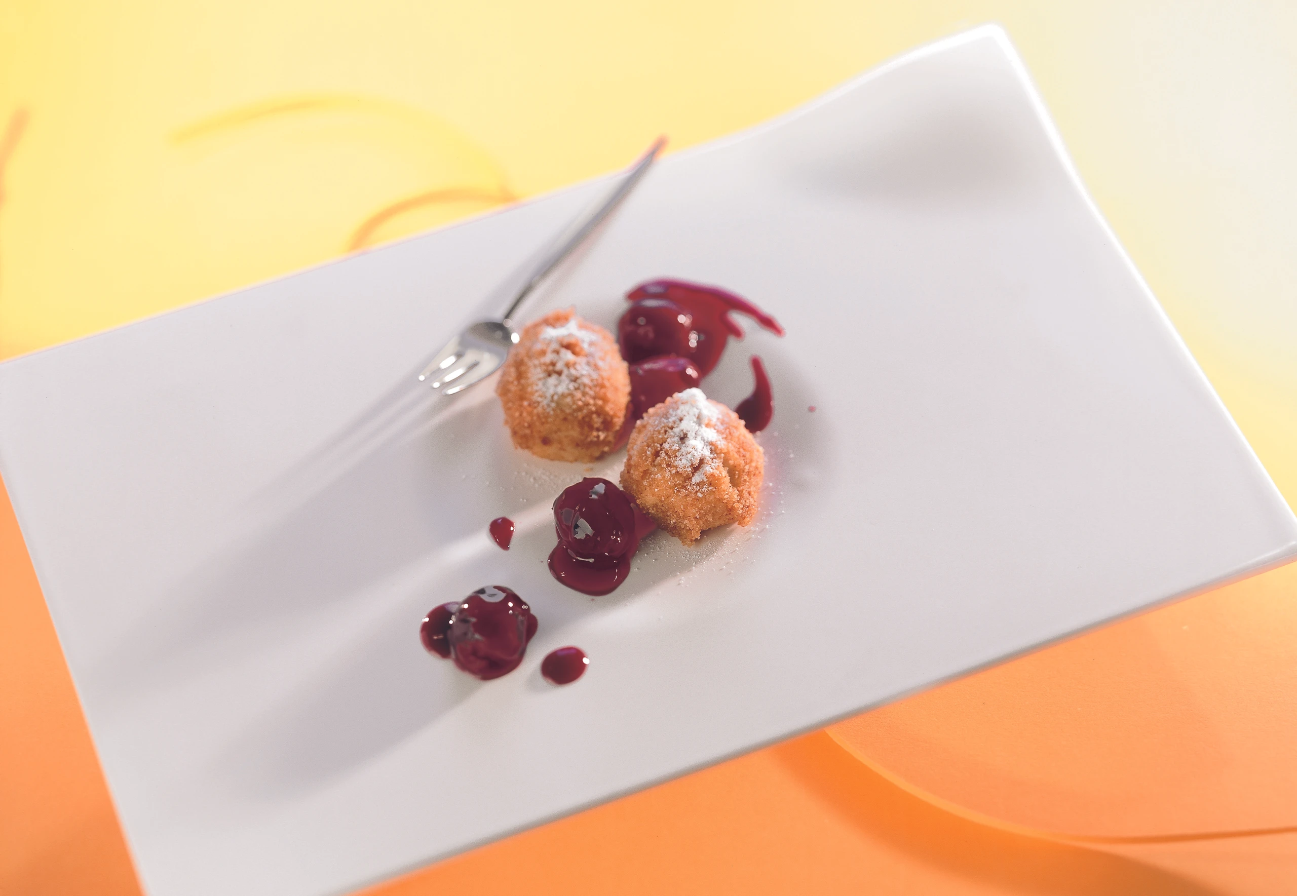 Während der Rotwein köchelt, für den Teig Milch, Butter, Zucker, Vanillezucker, Salz und die abgeriebene Zitronenschale aufkochen, Mehl zugeben und rühren, bis sich die Masse vom Geschirr löst. Masse in eine Schüssel geben, ca. 3 Minuten überkühlen lassen, dann die Dotter einrühren. Brandteig auskühlen lassen.
