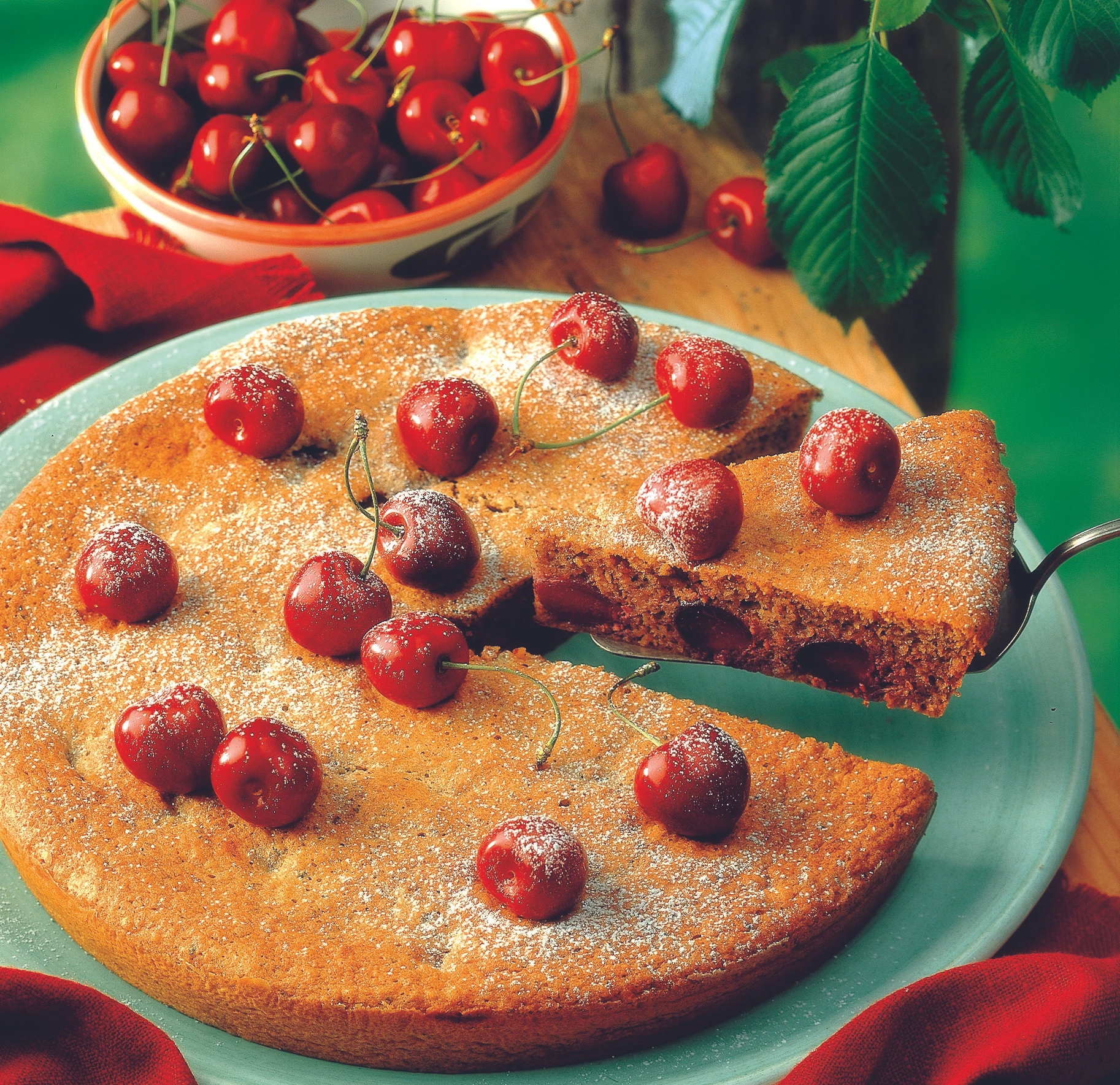 Die Hälfte des Teiges in die Form füllen und mit den entkernten Kirschen bestreuen, restlichen Teig gleichmäßig auf den Früchten verstreichen. Kuchen im vorgeheizten Rohr (mittlere Schiene / Gitterrost) ca. 40 Minuten backen.