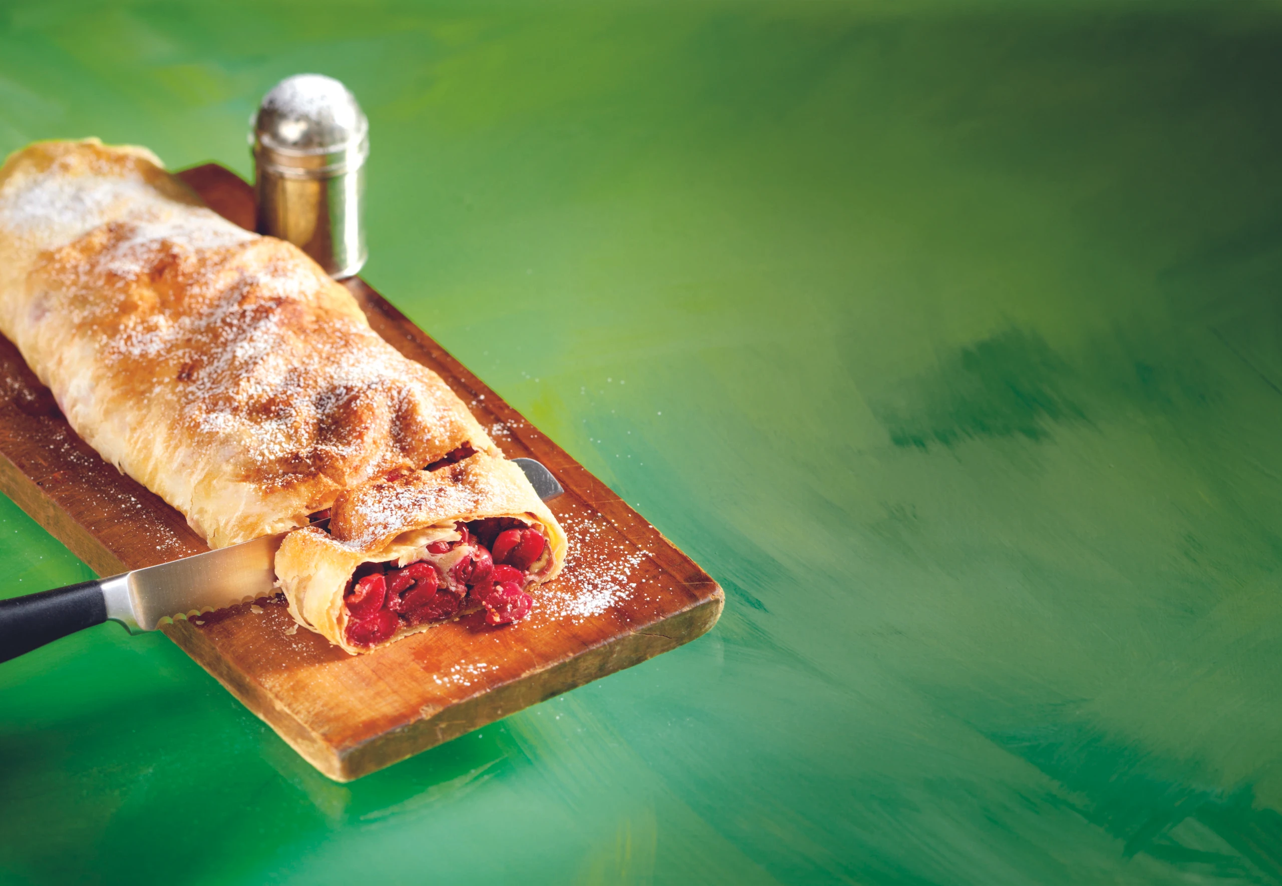 - Für das Zimtobers Obers schlagen und Zimt unterrühren. Strudel mit Staubzucker bestreuen, portionieren und mit dem Zimtobers garniert servieren.
