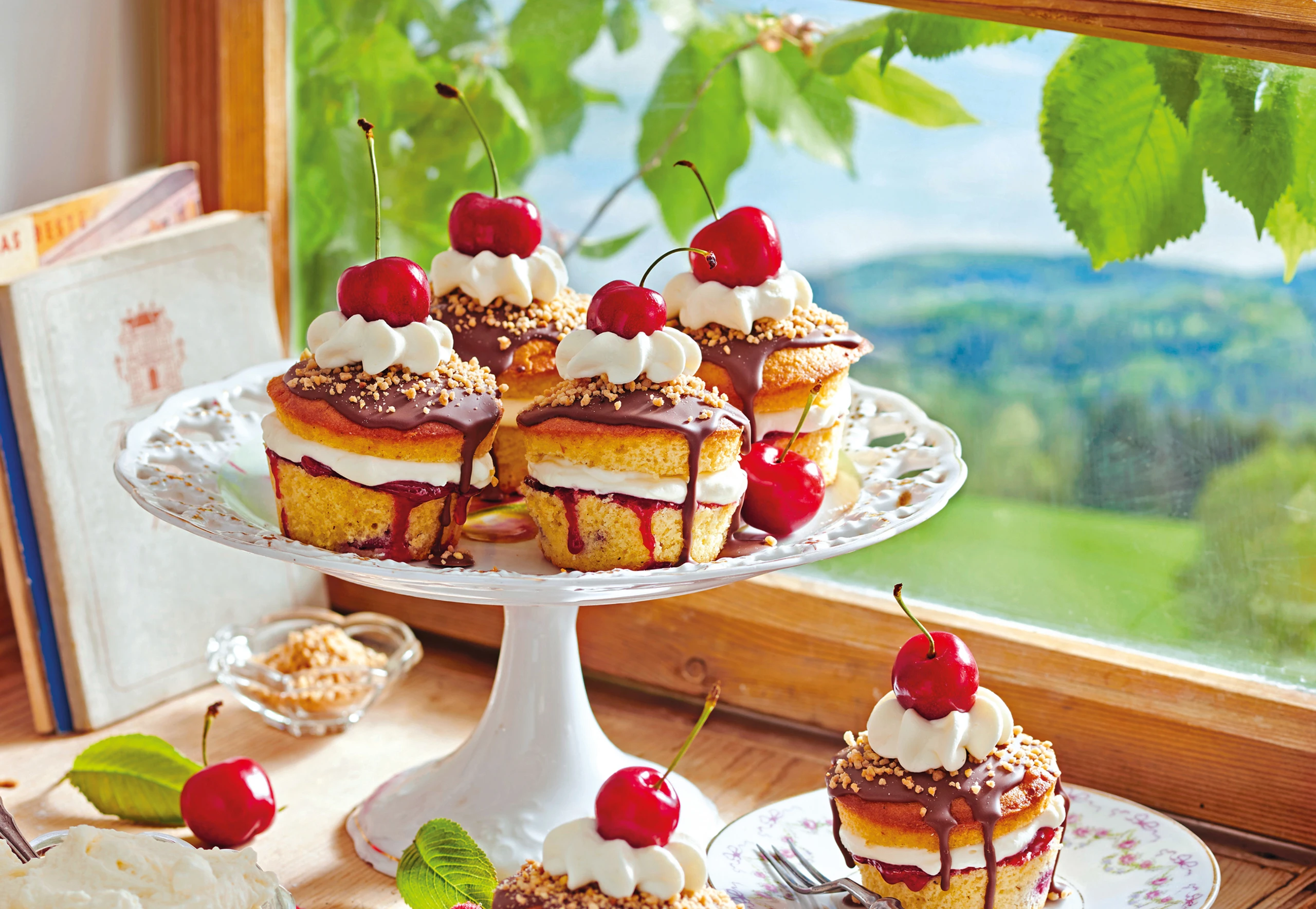 Für die Deko Kuvertüre und Kokosfett über einem Wasserbad schmelzen. Glasur auf den Törtchen verteilen und mit Krokant bestreuen. Törtchen mit Obers und Kirschen dekorieren.