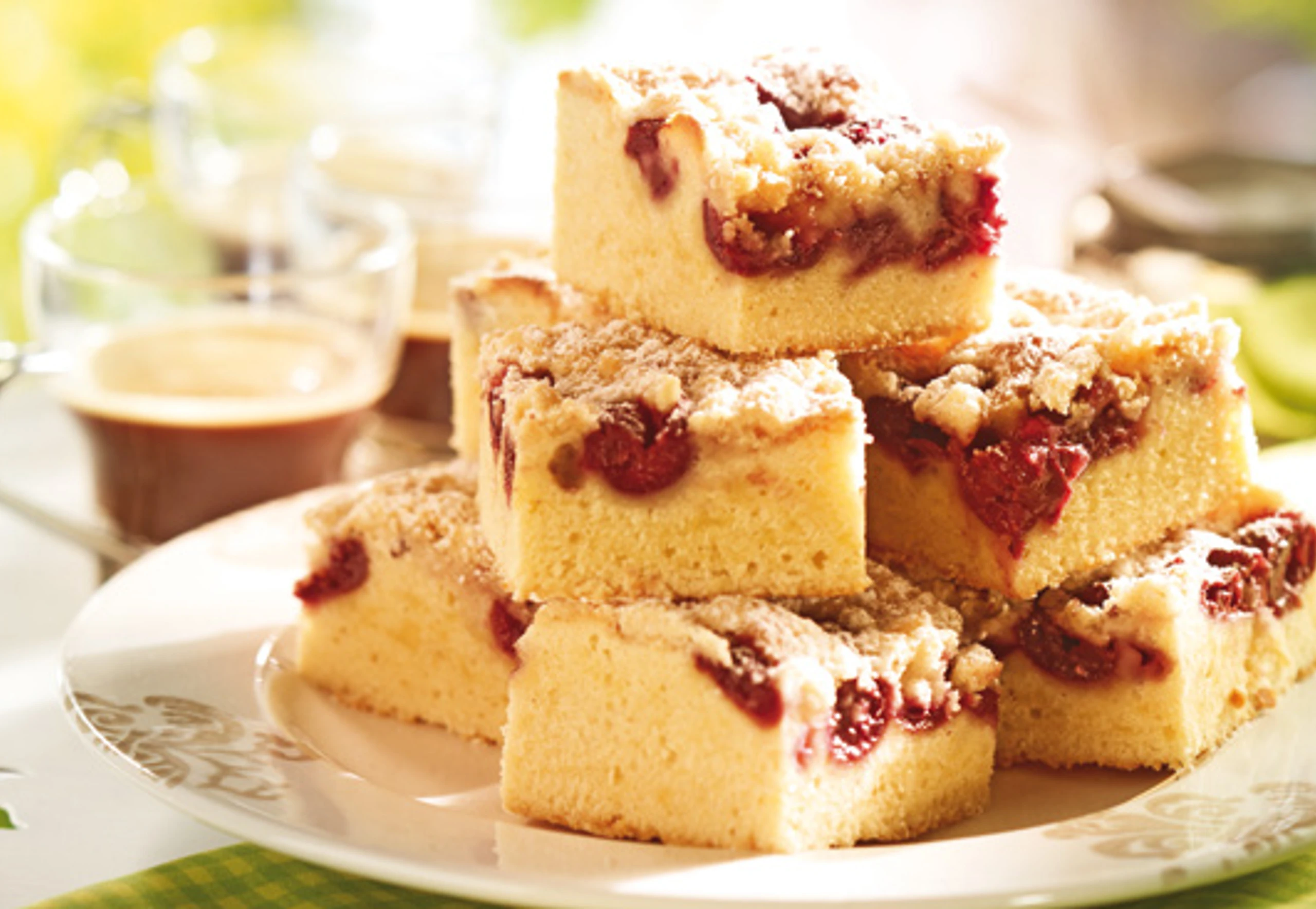 Masse in der Form verstreichen. Kirschen darauf verteilen. Streusel mit einer Küchenreibe grob über die Kirschen raspeln. Kuchen im Rohr (untere Schiene / Gitterrost) ca. 45 Minuten backen. Herausnehmen, auskühlen lassen, portionieren und mit Staubzucker bestreuen.