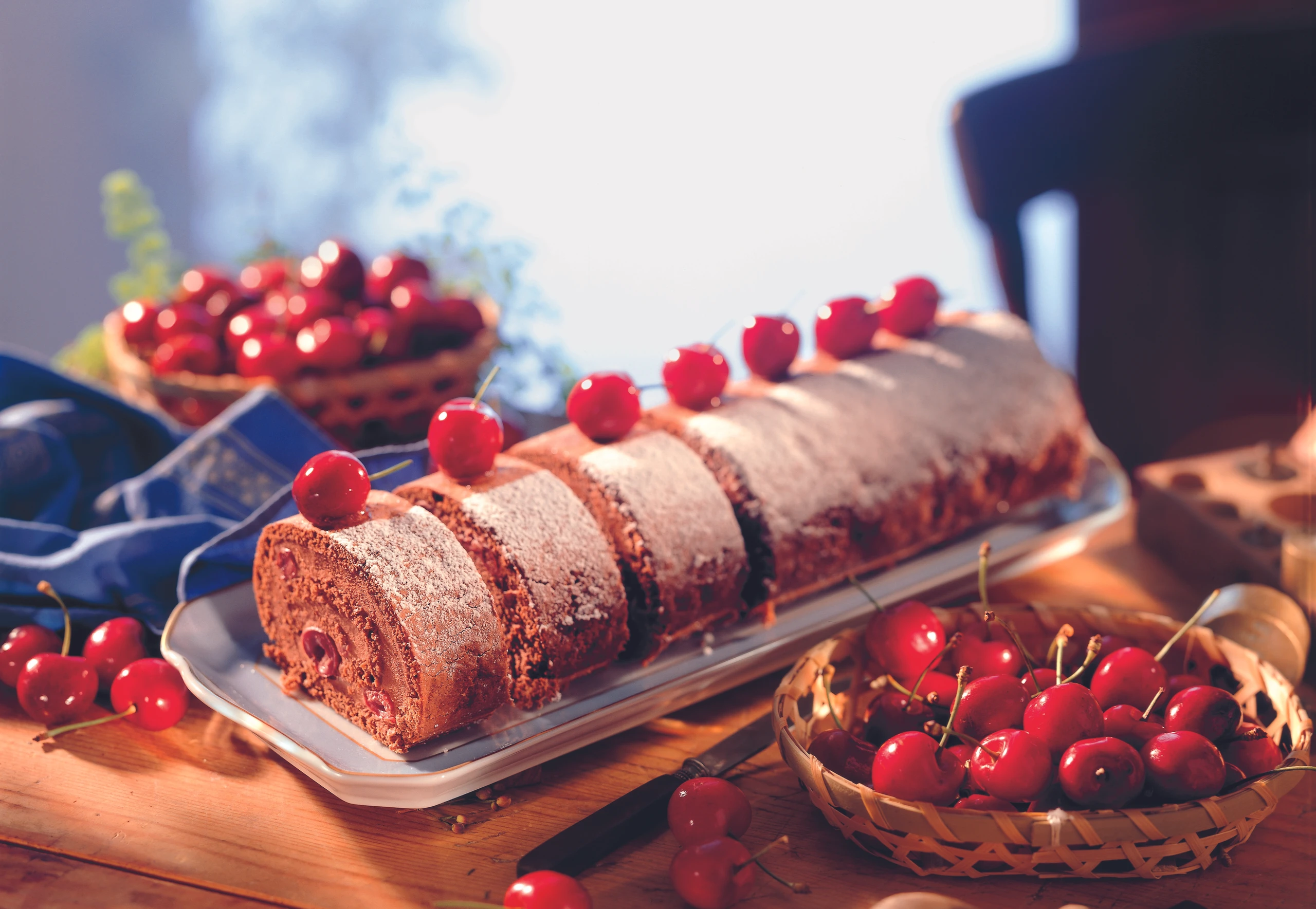 Mitgebackenes Papier vom Biskuit abziehen. Creme auf das Biskuit streichen, dabei am oberen Rand einen 3–4 cm breiten Streifen frei lassen. Creme mit Kirschen bestreuen. Biskuit straff einrollen, mit Backpapier umwickeln und ca. 2 Stunden kühlen.
