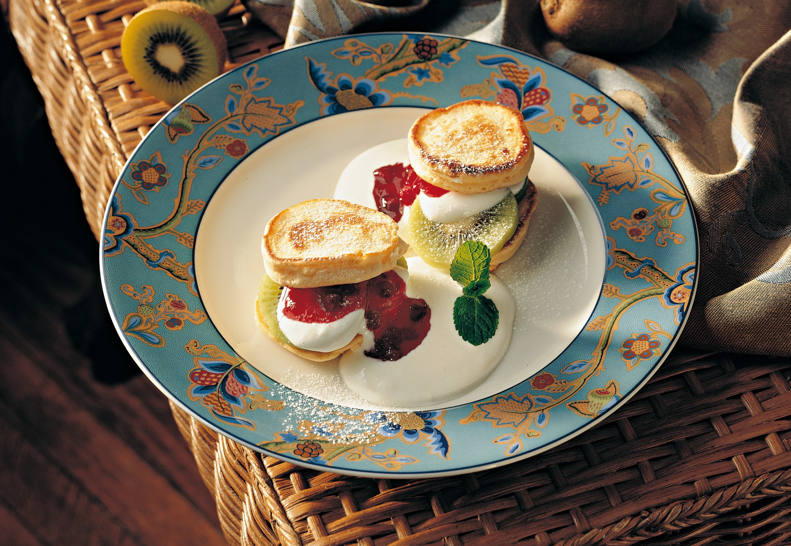 Die Hälfte der Dalken mit Kiwischeiben belegen, mit Rahm überziehen und mit Preiselbeermarmelade garnieren. Restliche Dalken daraufsetzen und mit Staubzucker und Minzeblättchen garnieren.