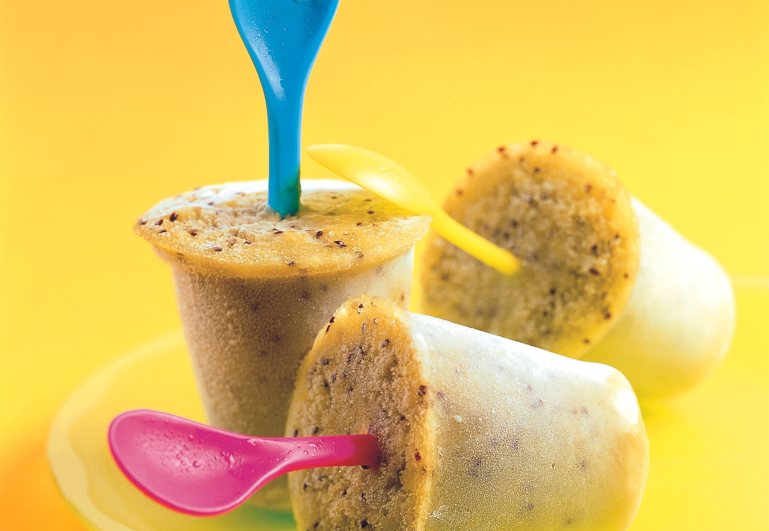 Kiwis schälen, in Stücke schneiden, mit Wasser und Kristallzucker vermischen und mit einem Stabmixer fein pürieren. Fruchtpüree in die Förmchen füllen und im Tiefkühler ca. 2 Stunden anfrieren.