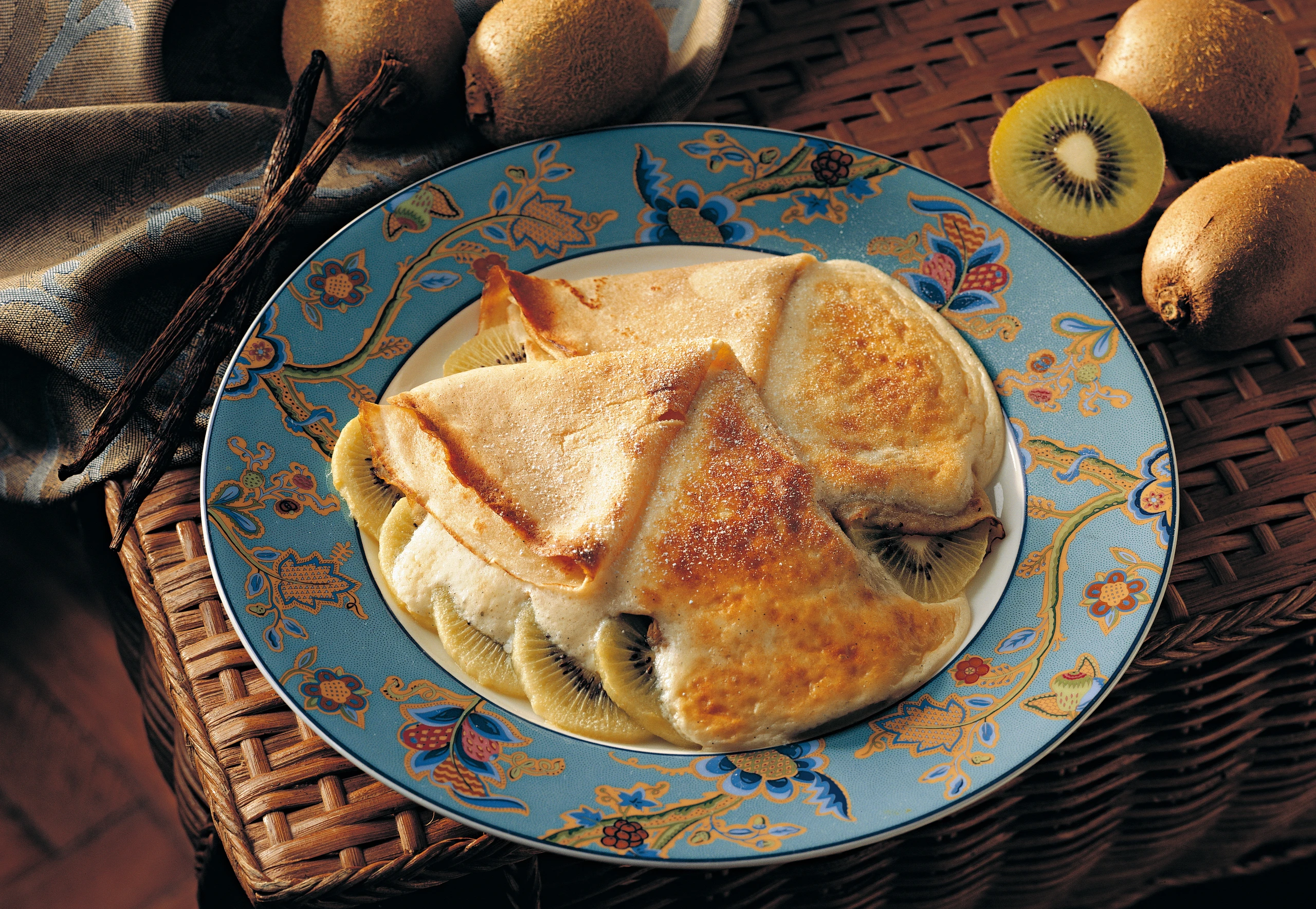 Aus dem Teig acht gleichgroße Palatschinken backen und nebeneinander auflegen. Kiwischeiben auf der unteren Hälfte auflegen, Palatschinken darüberklappen.