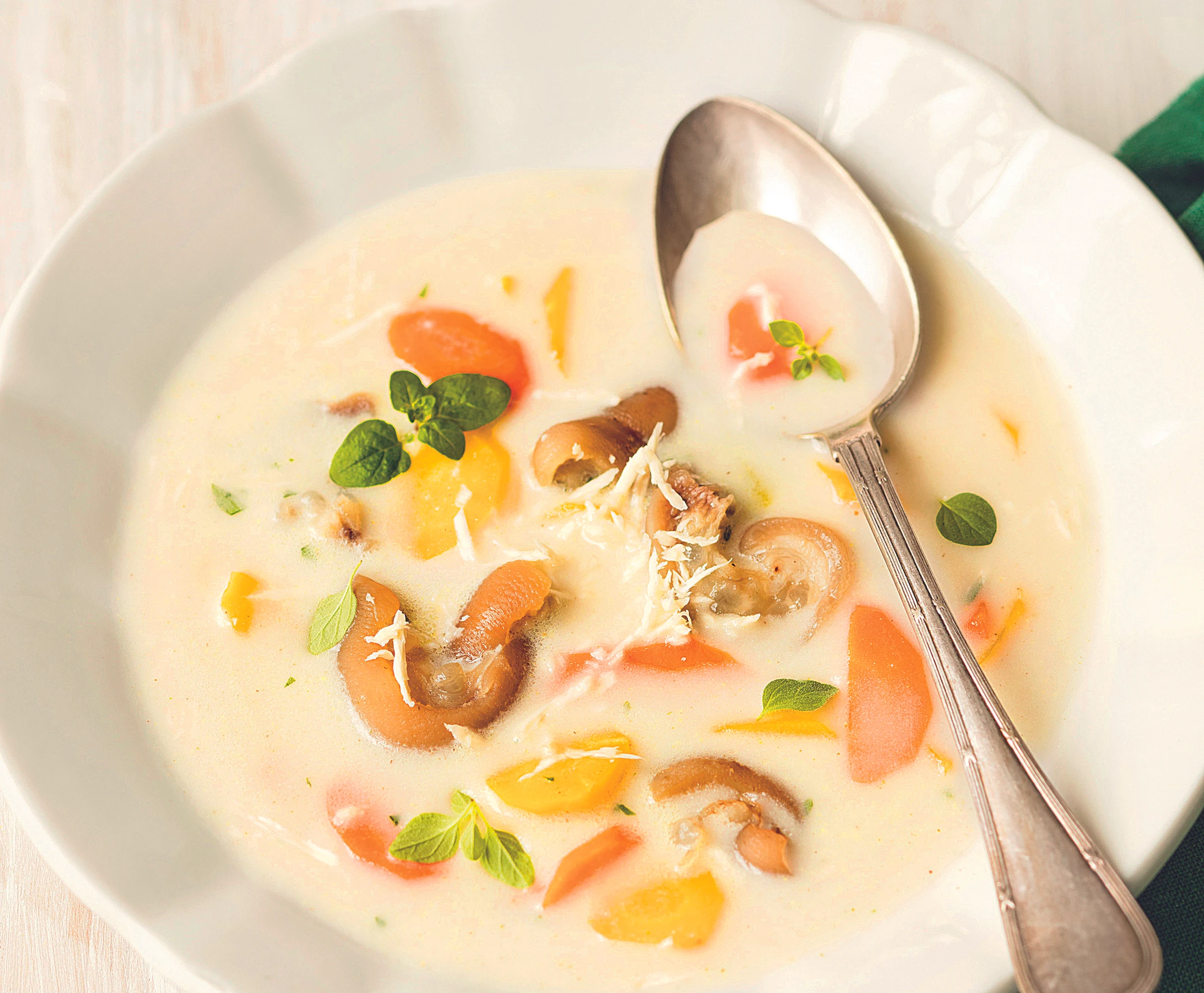Suppe anrichten und mit Majoran und Kren bestreut servieren.