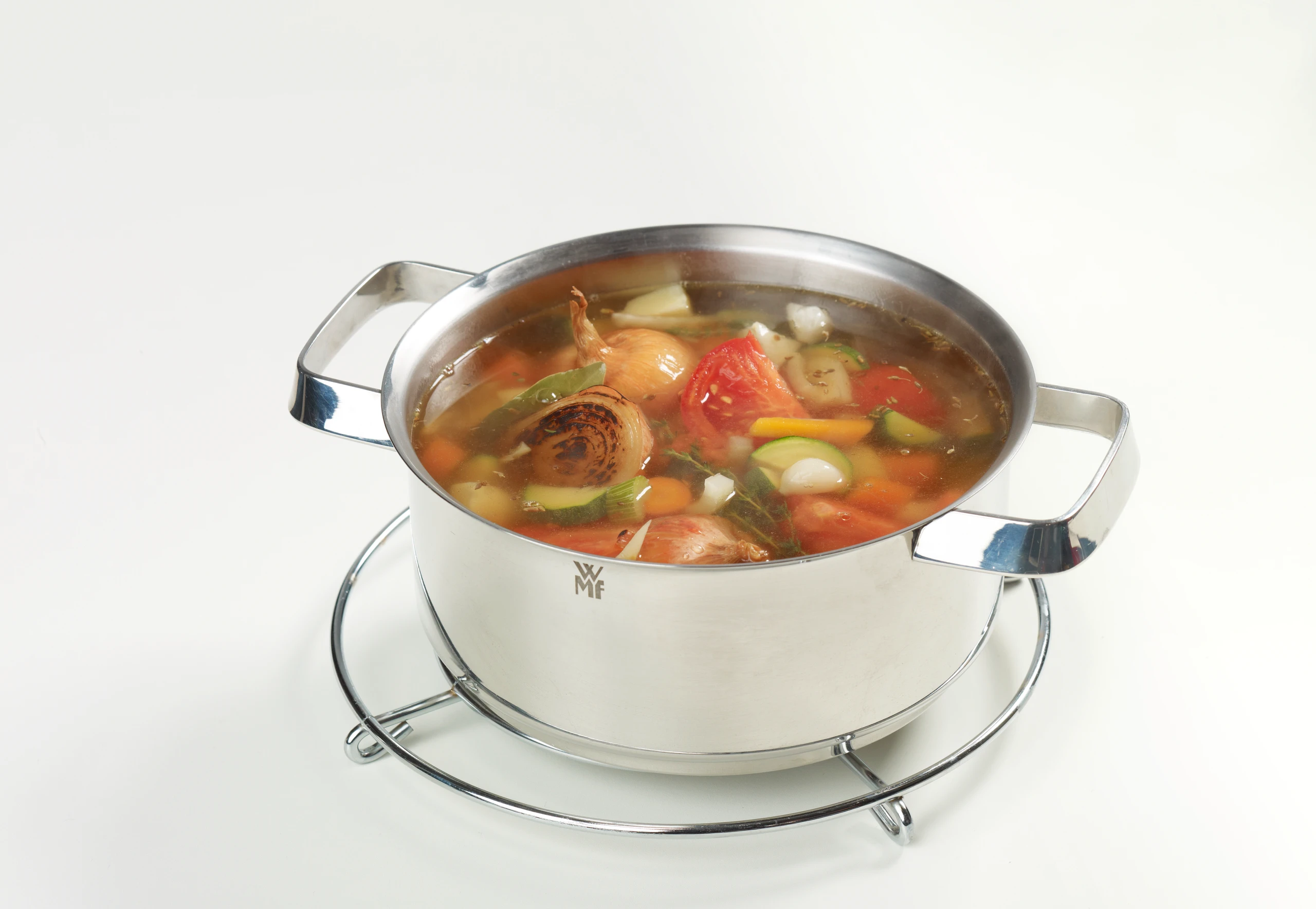 Gemüse, ausgenommen Paradeiser, und Knoblauch im Öl anschwitzen, mit Wein ablöschen und mit 4 l Wasser aufgießen. Suppe aufkochen, Zwiebeln, Paradeiser und Gewürze zugeben. Suppe ca. 45 Minuten schwach köcheln; dabei den aufsteigenden Schaum immer wieder mit einem Gitterlöffel entfernen.