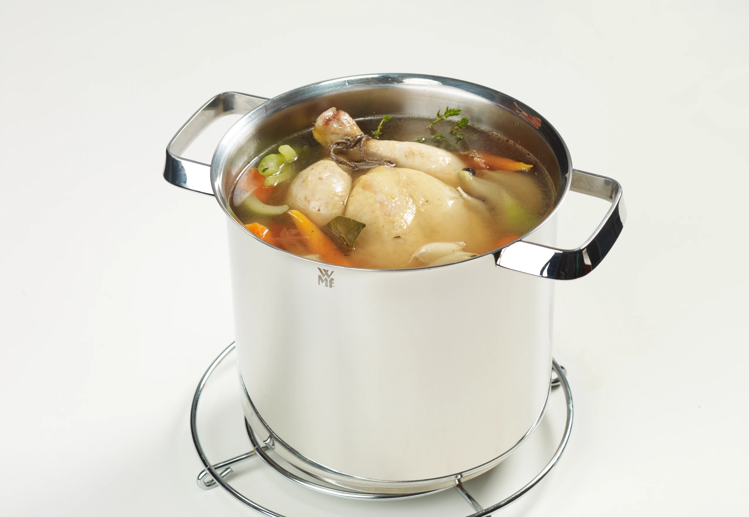 Ein Sieb über einen Topf hängen und mit einem feinen Tuch auslegen. Huhn aus der Suppe nehmen. Suppe durch das Sieb gießen, mit Salz abschmecken und abkühlen lassen.