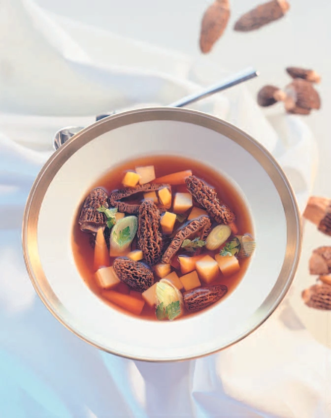 Klare Morchel-Erdäpfelsuppe mit Gemüse