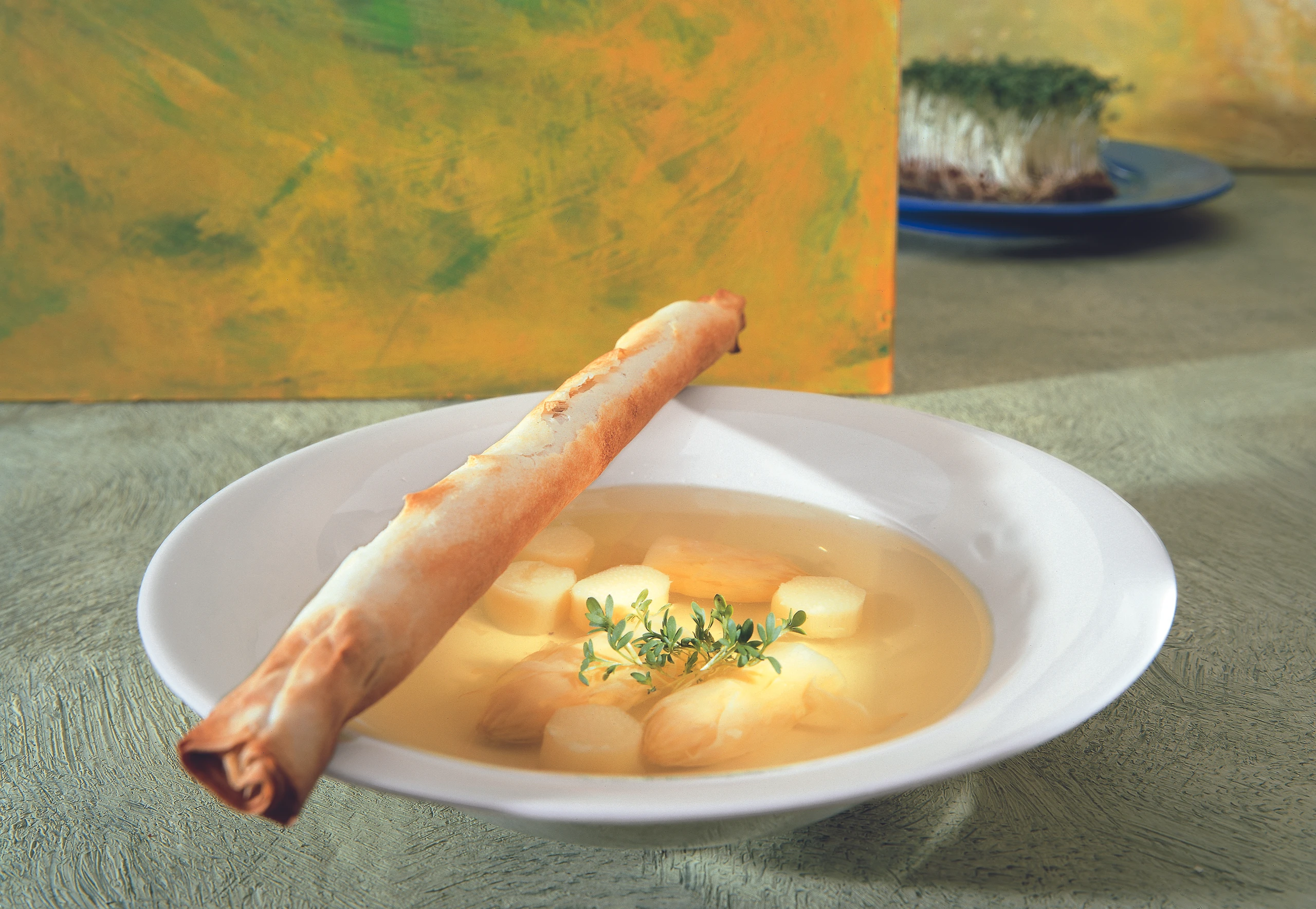Spargelstücke im Spargelfond erhitzen. Suppe mit dem heißen Kressestrudel anrichten. Mit Kresseblättchen garnieren.
