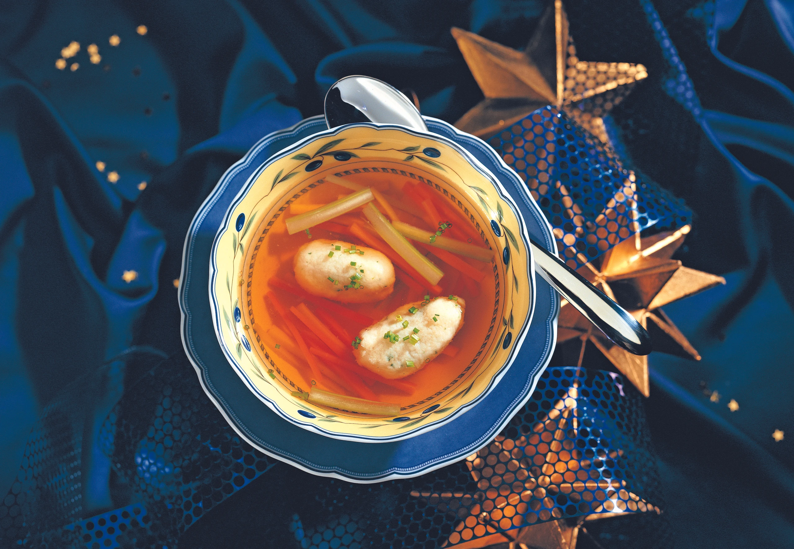 Schnittlauch fein schneiden. Nockerl mit einem Siebschöpfer aus dem Wasser heben und gut abtropfen lassen. Suppe aufkochen, Gemüse darin erwärmen. Suppe in Teller schöpfen, mit den Nockerln als Einlage und mit Schnittlauch bestreut servieren.