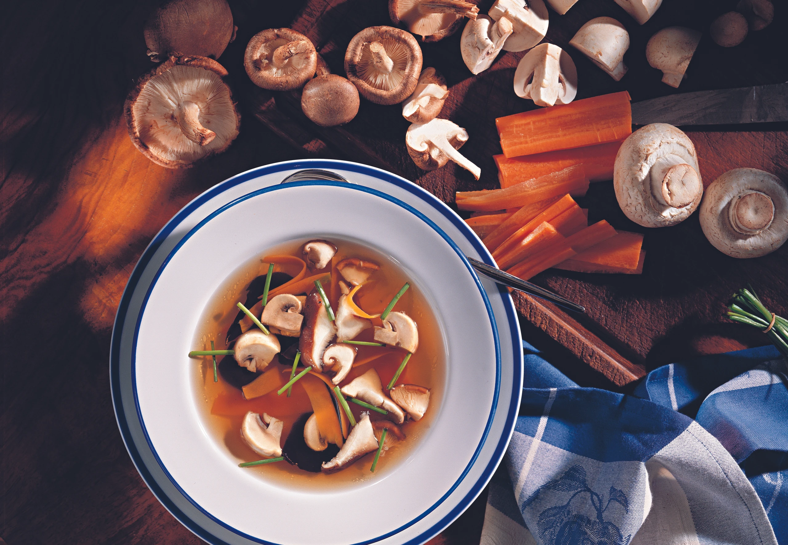 Mu Err Pilze gut abtropfen lassen, in gleichgroße Stücke schneiden und mit den übrigen Pilzen, den Karottenstreifen und dem Einweichwasser in die Suppe geben. Suppe aufkochen und auf kleiner Flamme ca. 20 Minuten köcheln.