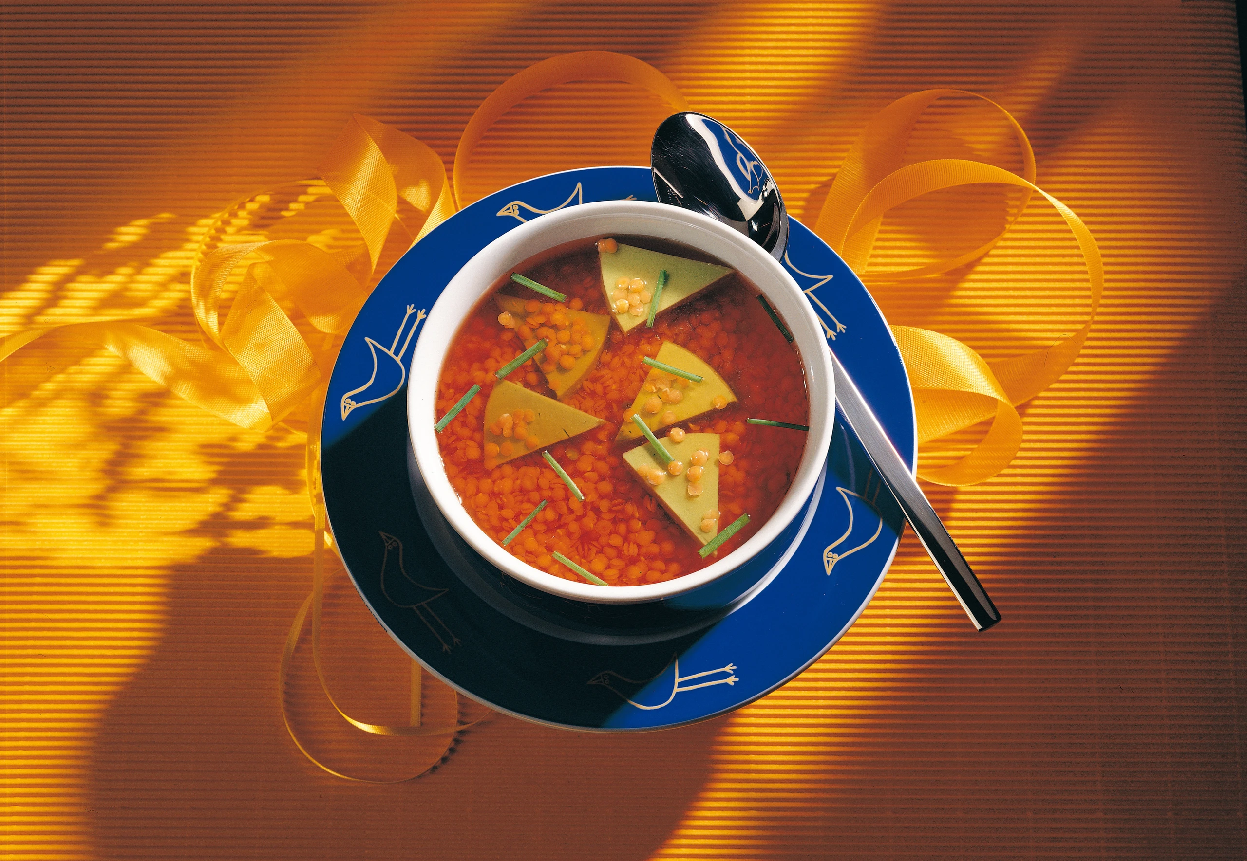 Schnittlauch fein schneiden. Die Suppe erhitzen, in Teller schöpfen, mit Eierstich und Linsen als Einlage und mit Schnittlauch bestreut servieren.