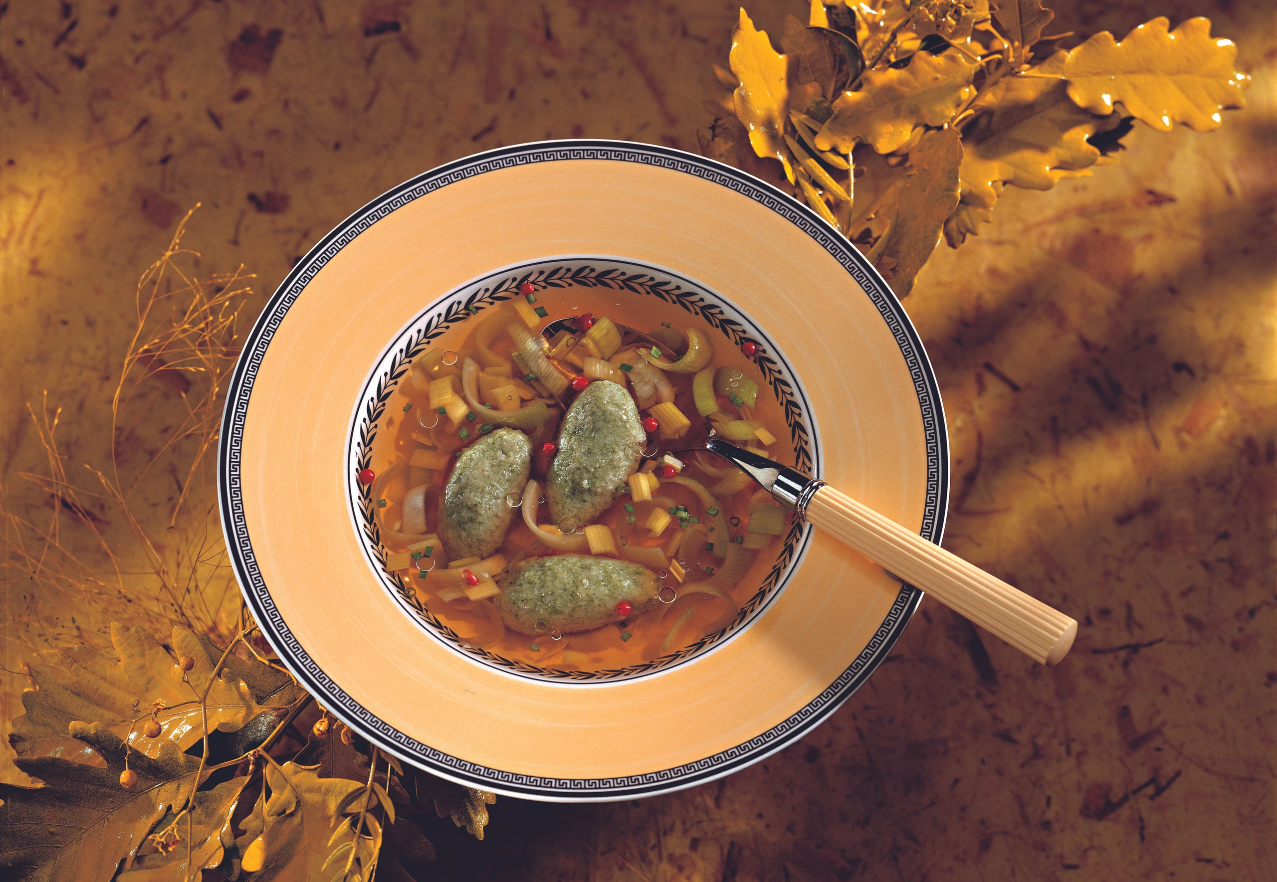 Die Suppe in Teller schöpfen, mit den Nockerln als Einlage und mit Schnittlauch und Pfefferbeeren bestreut servieren.