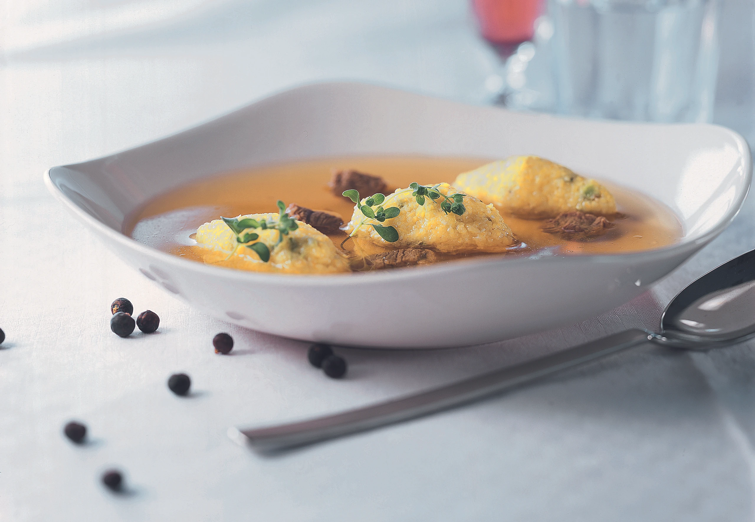 Nockerl in kochendes Salzwasser legen. Topf vom Herd ziehen, die Nockerl zugedeckt 12 Minuten gar ziehen lassen. Parallel dazu Wildfleisch in 1 1/2 cm große Würfel schneiden. Ca. 200 ml von der Suppe aufkochen, Fleisch einlegen und bei schwacher Hitze 10 Minuten köcheln lassen.