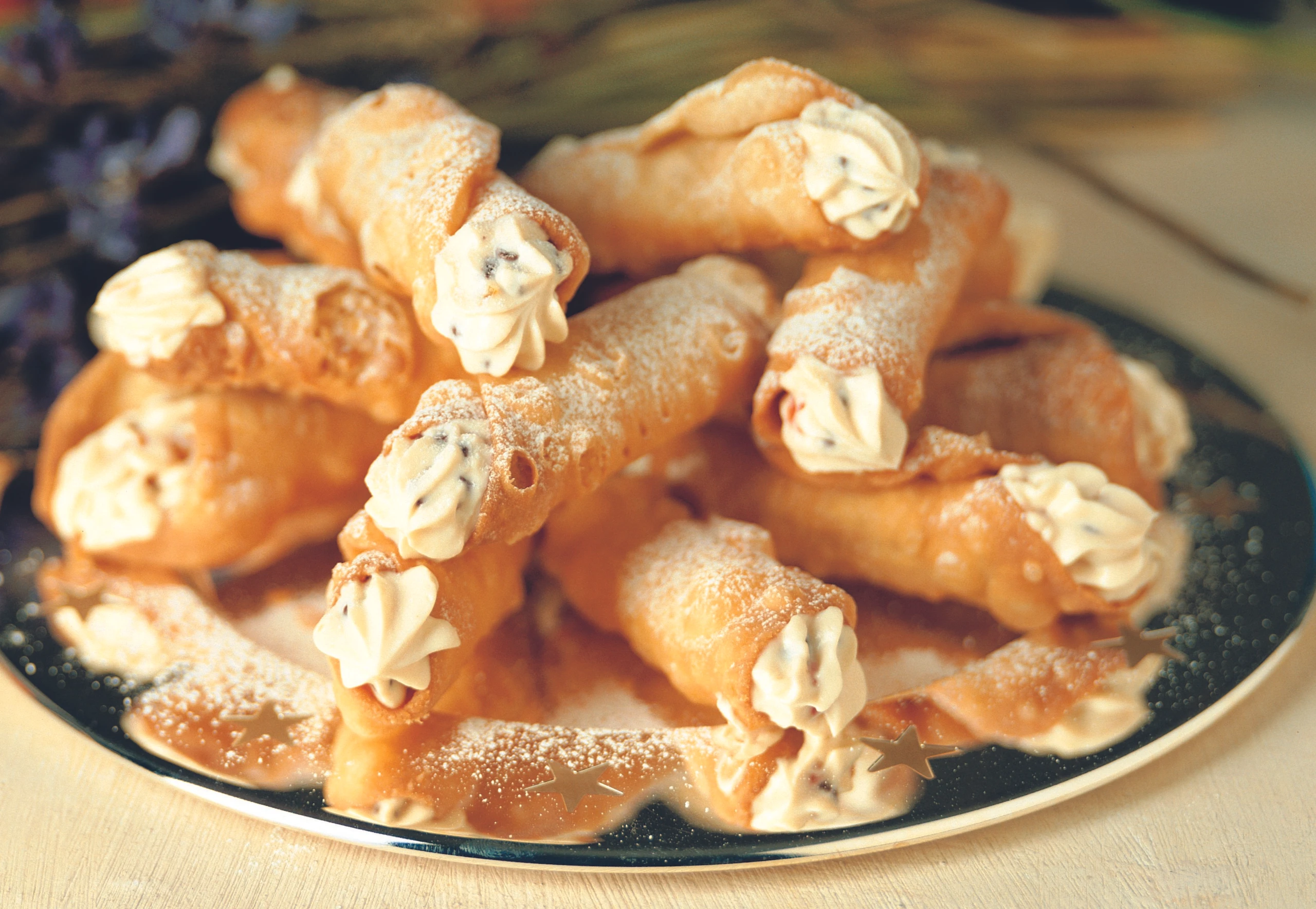 Formen aus den Röllchen ziehen. Ricottamasse mit einem Dressiersack (Sterntülle) in die Teigröllchen füllen. Die Cannoli mit Staubzucker bestreut servieren.