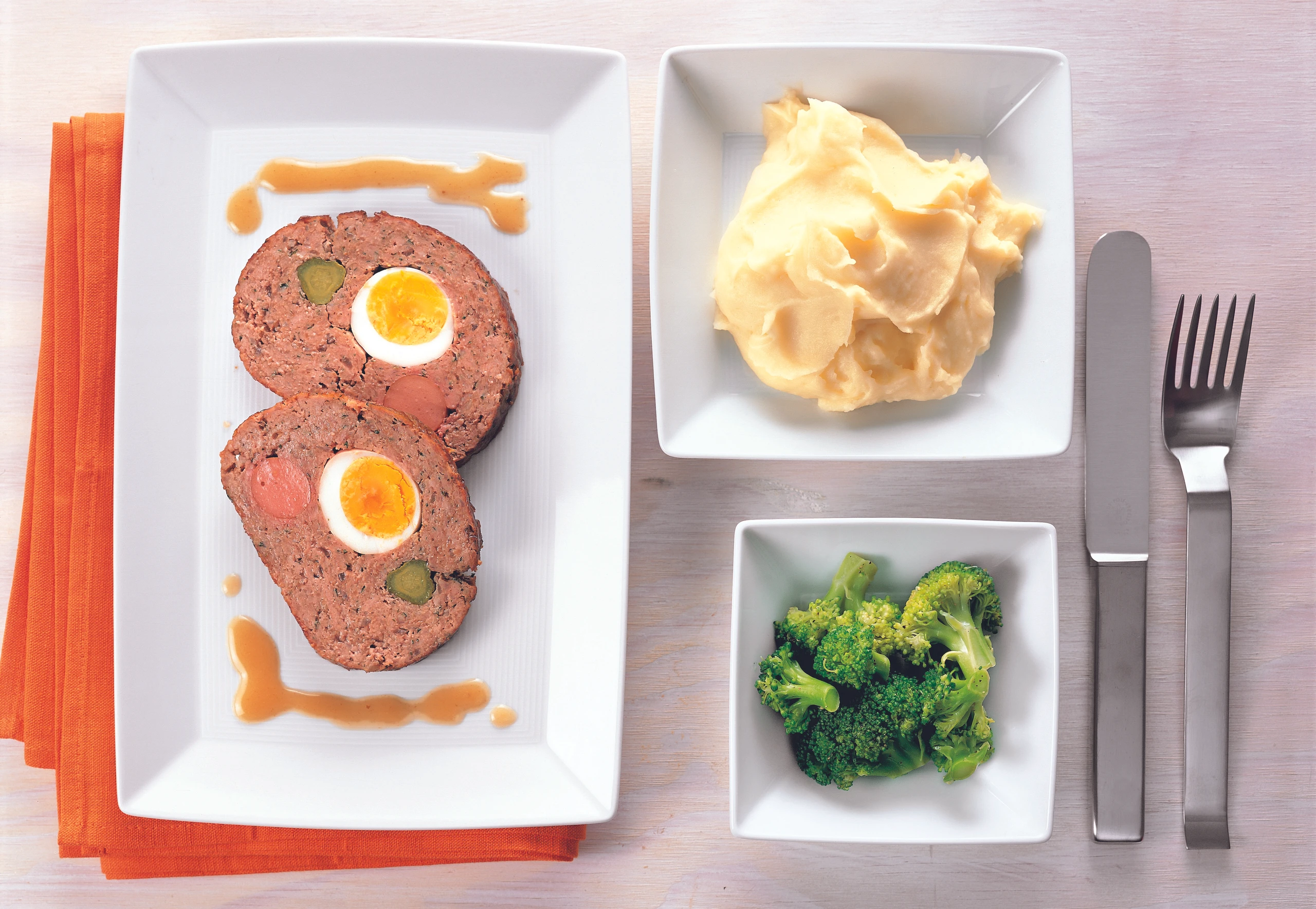 Eier, Essiggurken und Würstel hineinlegen. Restliches Fleisch darauf geben, an den Längsseiten andrücken, mit befeuchteten Händen einen Striezel formen.