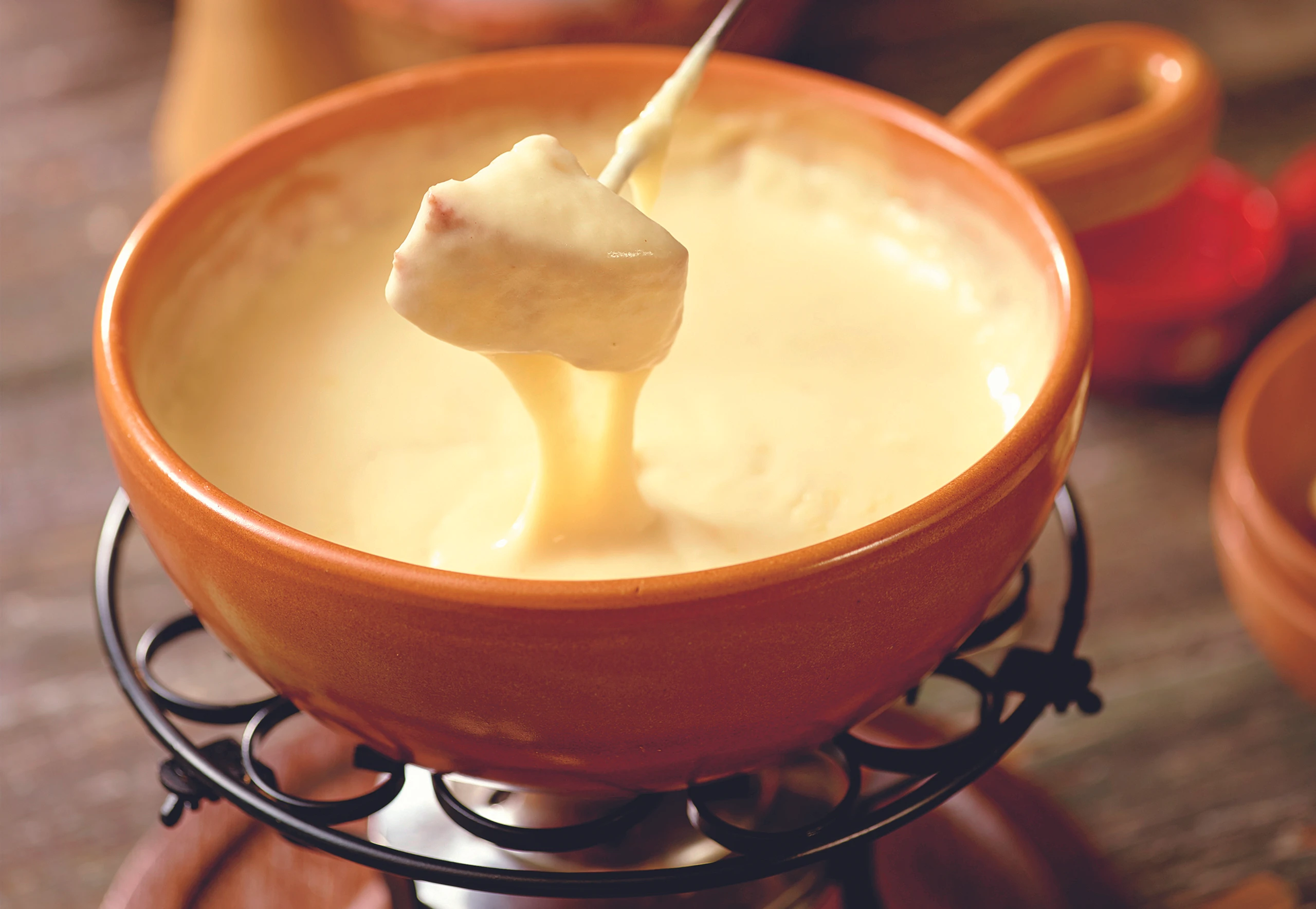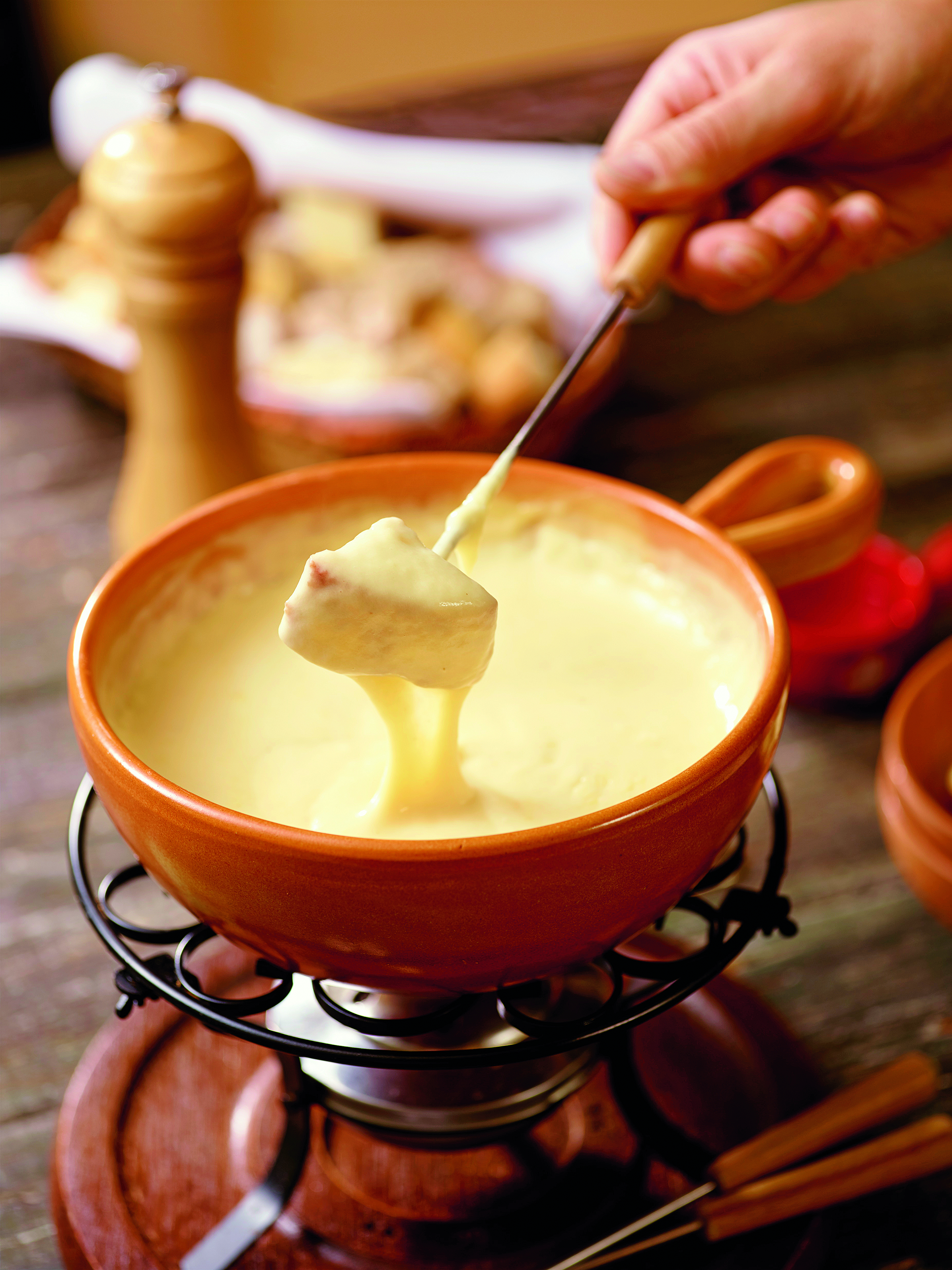 - Caquelon auf den Rechaud stellen. Brot in Achter-Schleifen durch den Käse ziehen, mit Pfeffer bestreuen.