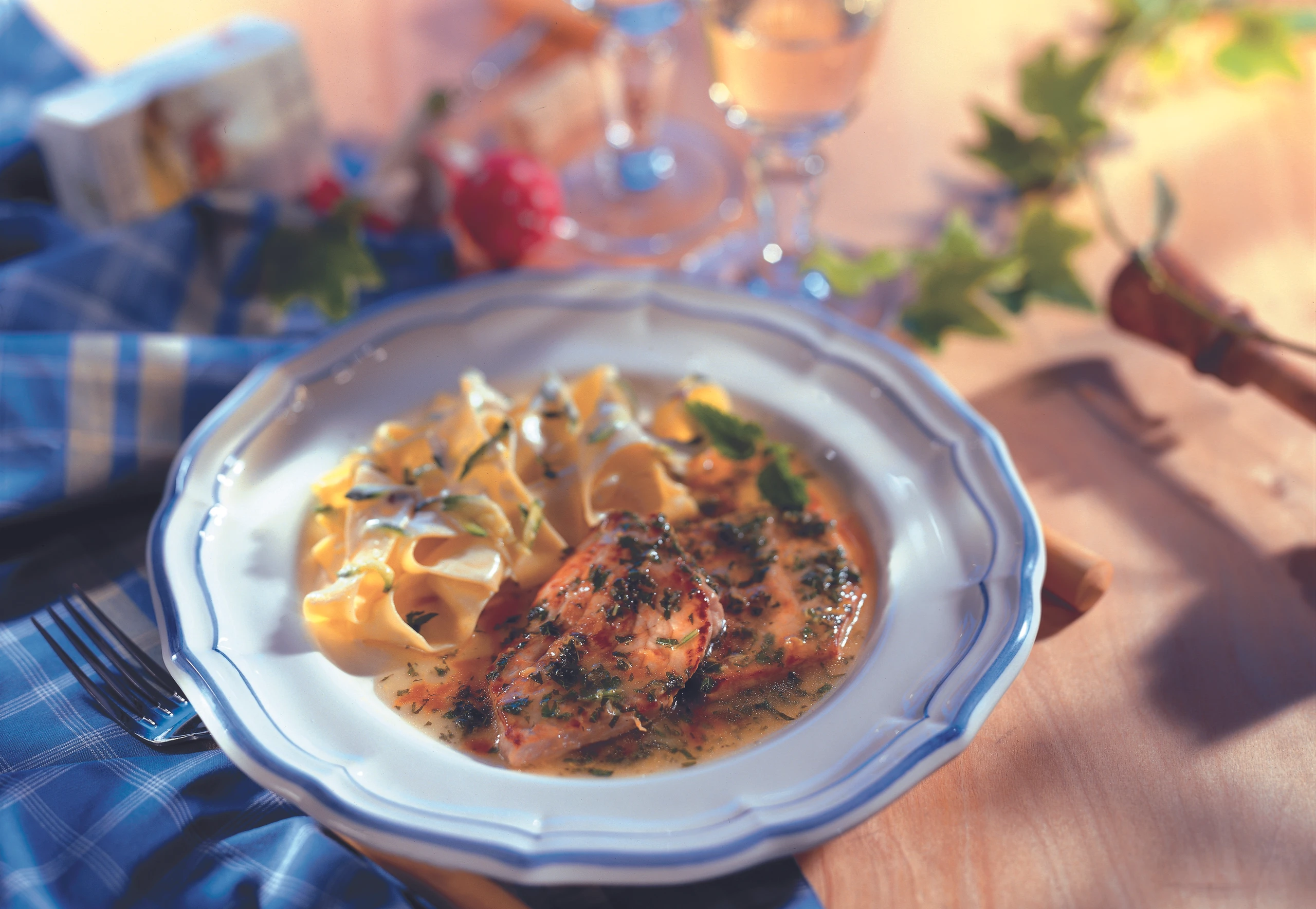 Kleine Kalbsschnitzel mit Zitronen-Melissesauce und Bandnudeln