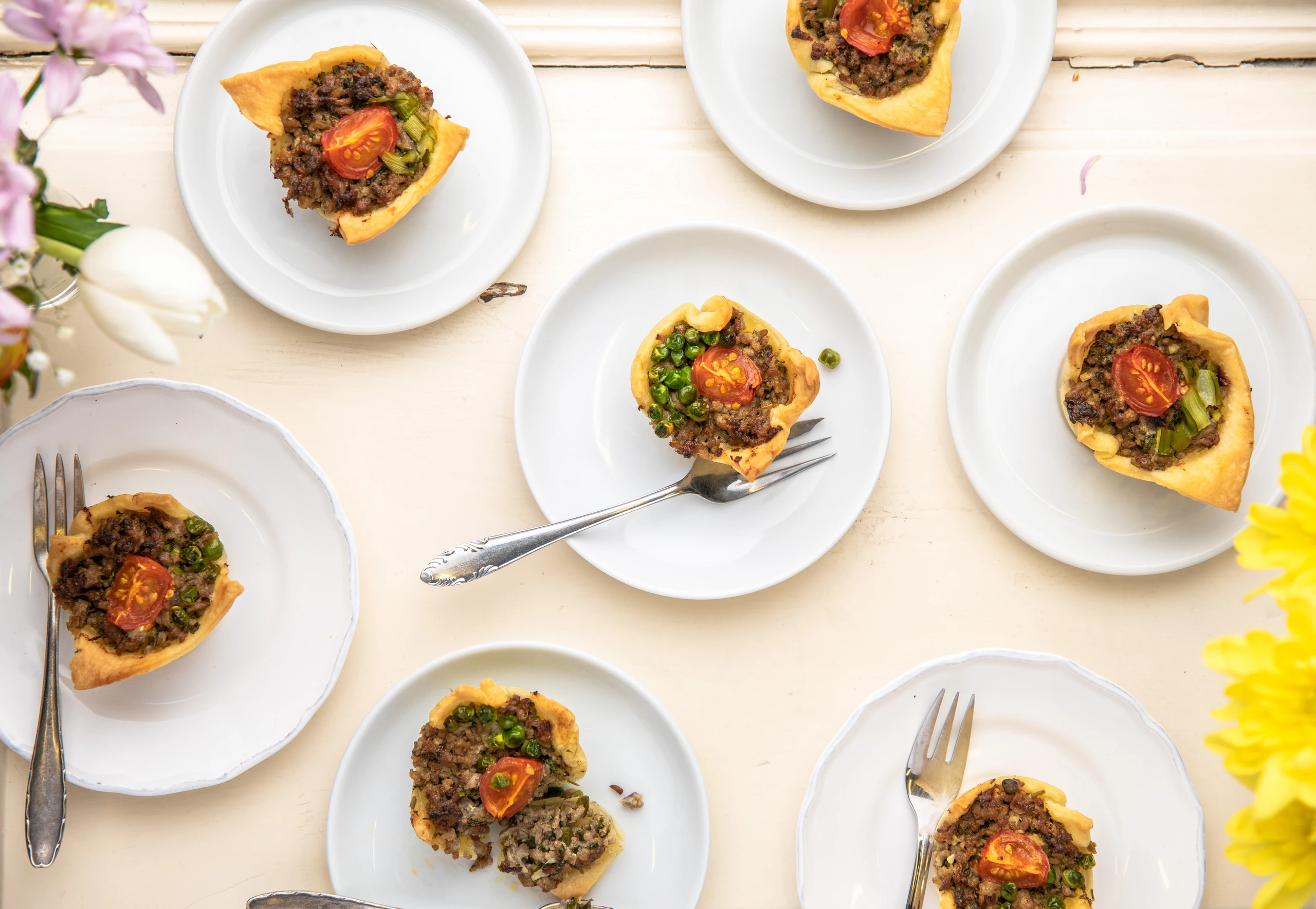 Teig auf einer bemehlten Arbeitsfläche ausrollen und in 12 Rechtecke schneiden. In die Mulden der Form legen. Je 1 EL Fülle in die Mulden geben, einen Würfel Cheddar darauf setzen, mit je 1 EL Fülle abdecken und mit Paradeiserstücken, Erbsen und Stangensellerie belegen.