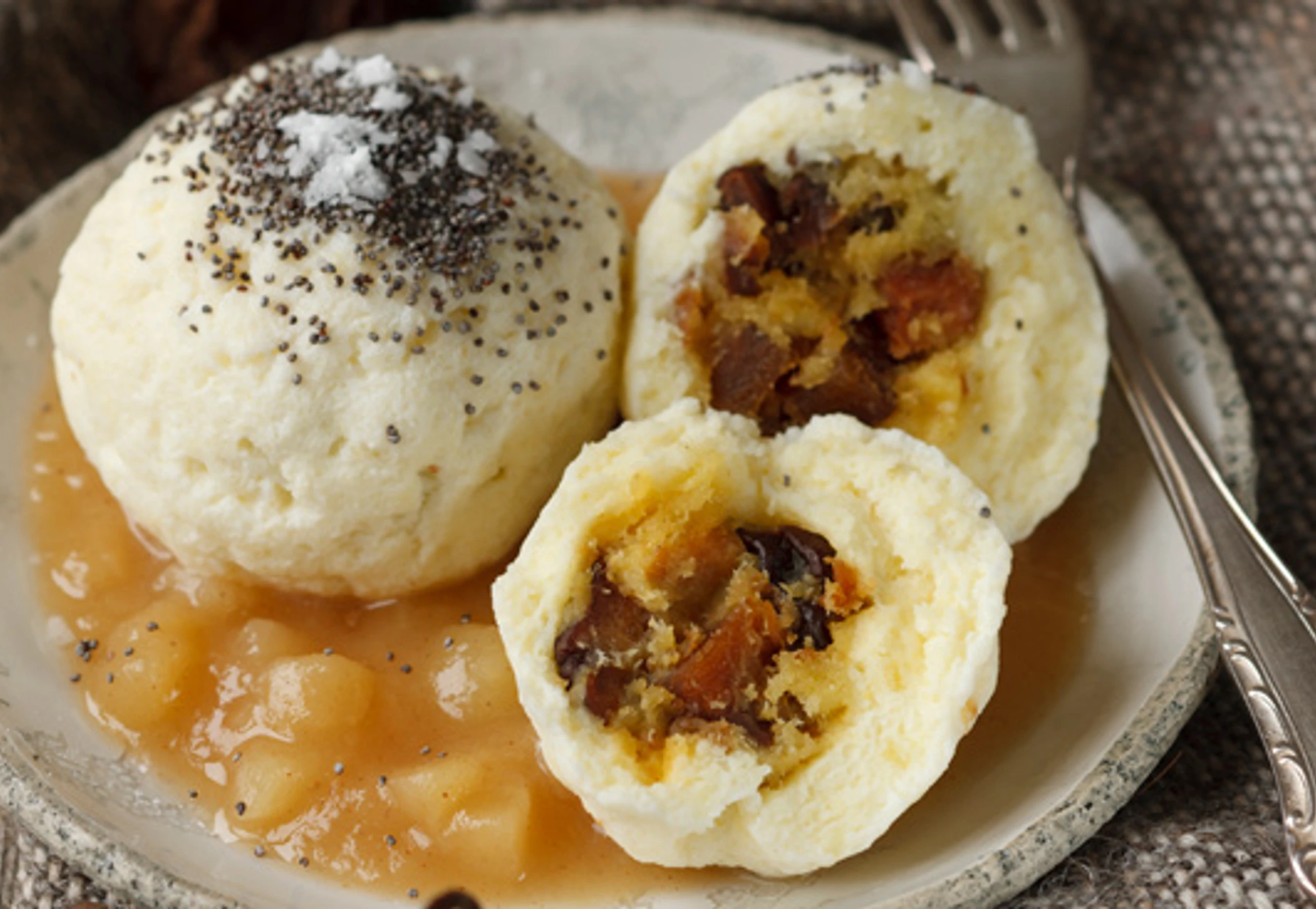 Teig zu einer Rolle formen und in 8 Portionen teilen. Fülle in 8 Portionen teilen und zu Kugeln formen. Teigstücke flach drücken, mit je einer Fülle-Kugel belegen, Teig über die Fülle ziehen und Knödel formen.