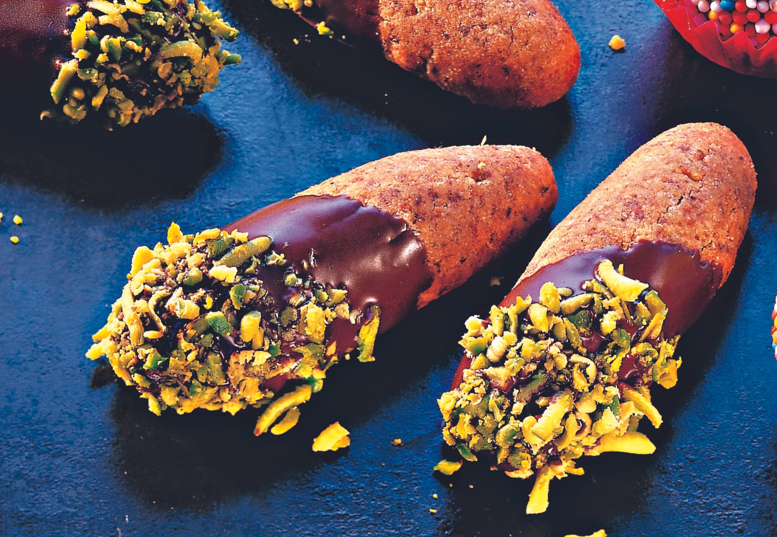 Stangerl aus dem Rohr nehmen und auskühlen lassen. Schokolade über einem heißen Wasserbad schmelzen. Stangerl zur Hälfte in die Schokolade tauchen, auf Backpapier legen, mit Pistazien bestreuen und die Glasur fest werden lassen.