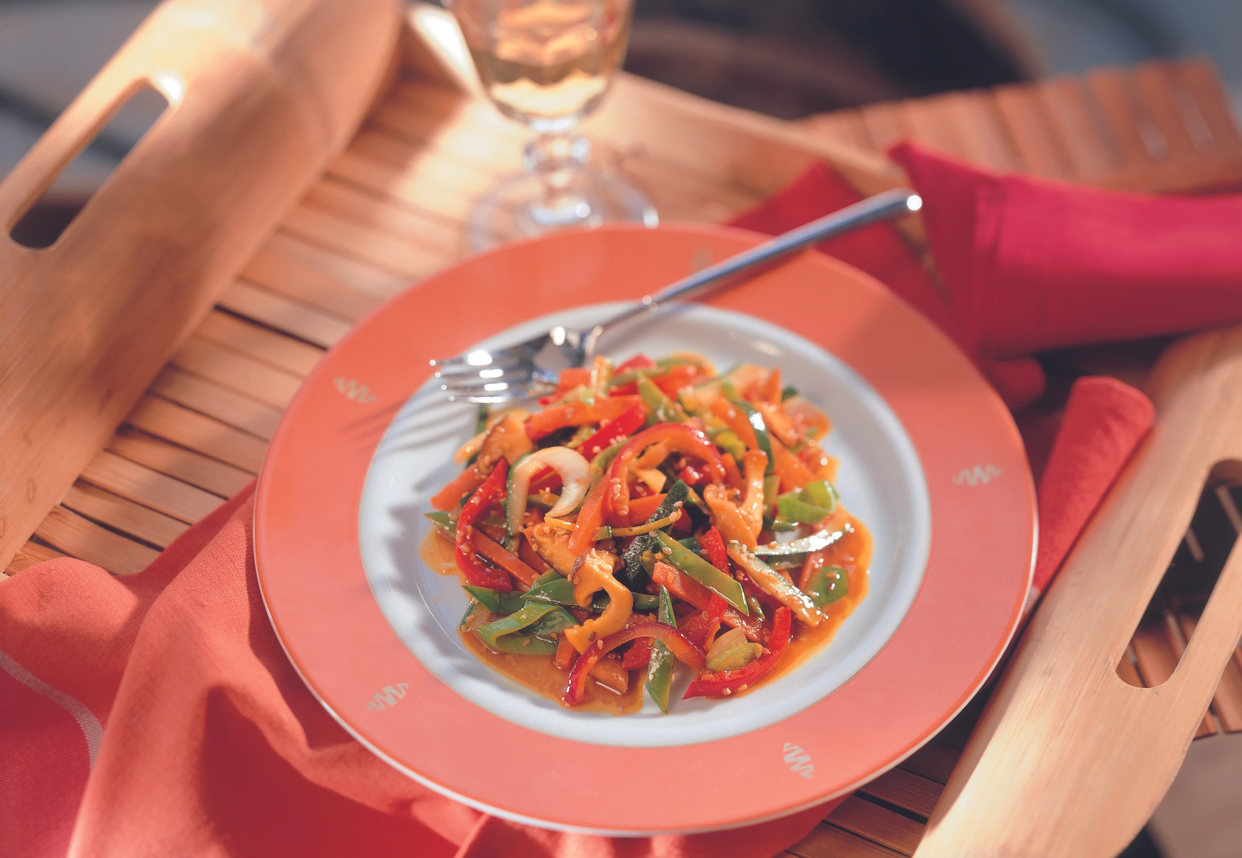 Karotten, Zwiebel und Knoblauch schälen. Zucchini, Paprika, Erbsenschoten, Pilze und Lauch putzen und waschen, gemeinsam mit den Karotten in ca. 1/2 cm breite Streifen schneiden. Zwiebel in dünne Scheiben schneiden.