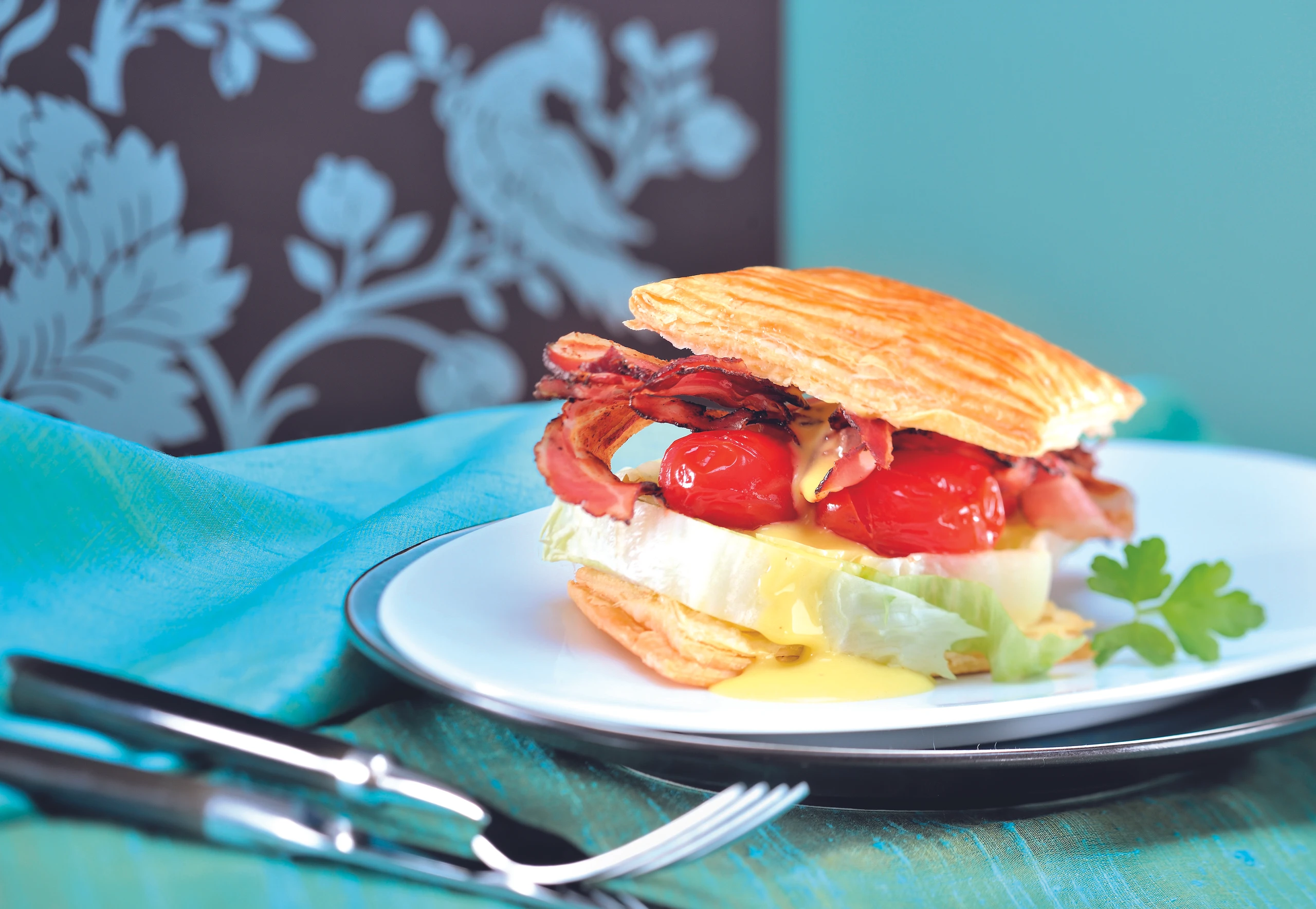 Salat in 8 Scheiben schneiden. Teigstücke mit einem Sägemesser horizontal durchschneiden. Salat, Paradeiser, Speck und Salsa auf den Böden verteilen, Deckel draufsetzen. Eisberg-Burger rasch servieren.