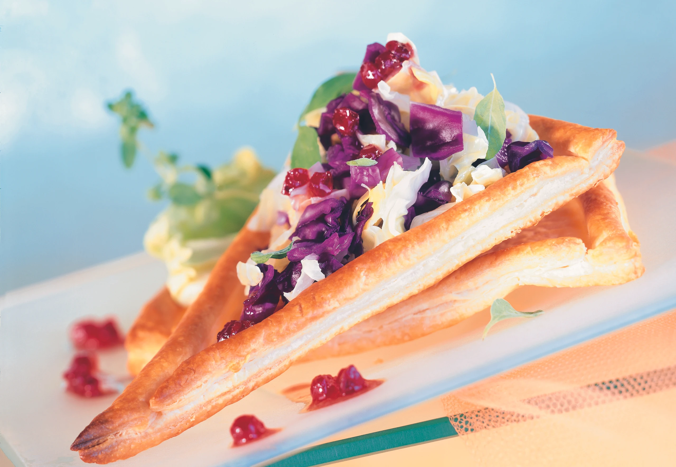 Backblech mit Backpapier belegen. Blätterteig aufrollen und in 3 gleich große Teile scheiden, 2 Teile diagonal durchschneiden, auf das Backblech legen und mit verquirltem Ei bestreichen. Den dritten Teil in 1 cm breite Streifen schneiden, die Teigränder damit belegen und nochmals bestreichen. Teig mit einer Gabel mehrmals einstechen (damit er sich beim Backen nicht wölbt) und mindestens 30 Minuten rasten lassen. Backrohr auf 200 °C vorheizen.
