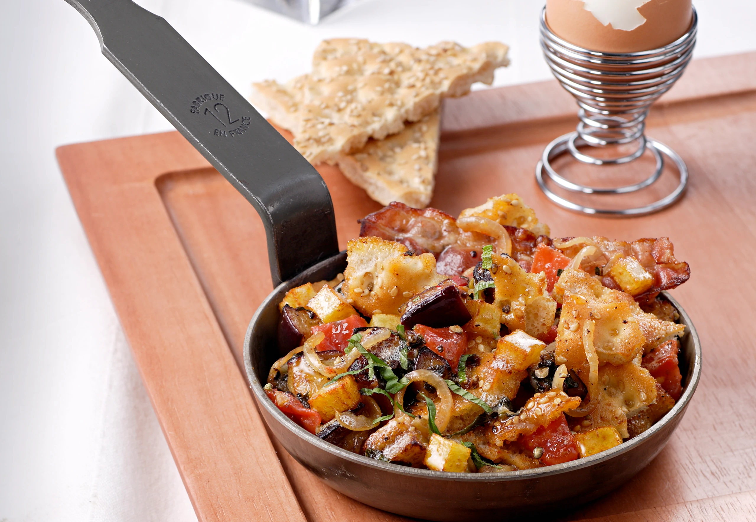 Knäckebrot und Erdäpfel in Butter braten, Melanzanigemüse und Minze unterheben. Gröstl mit Rahm garniert servieren.