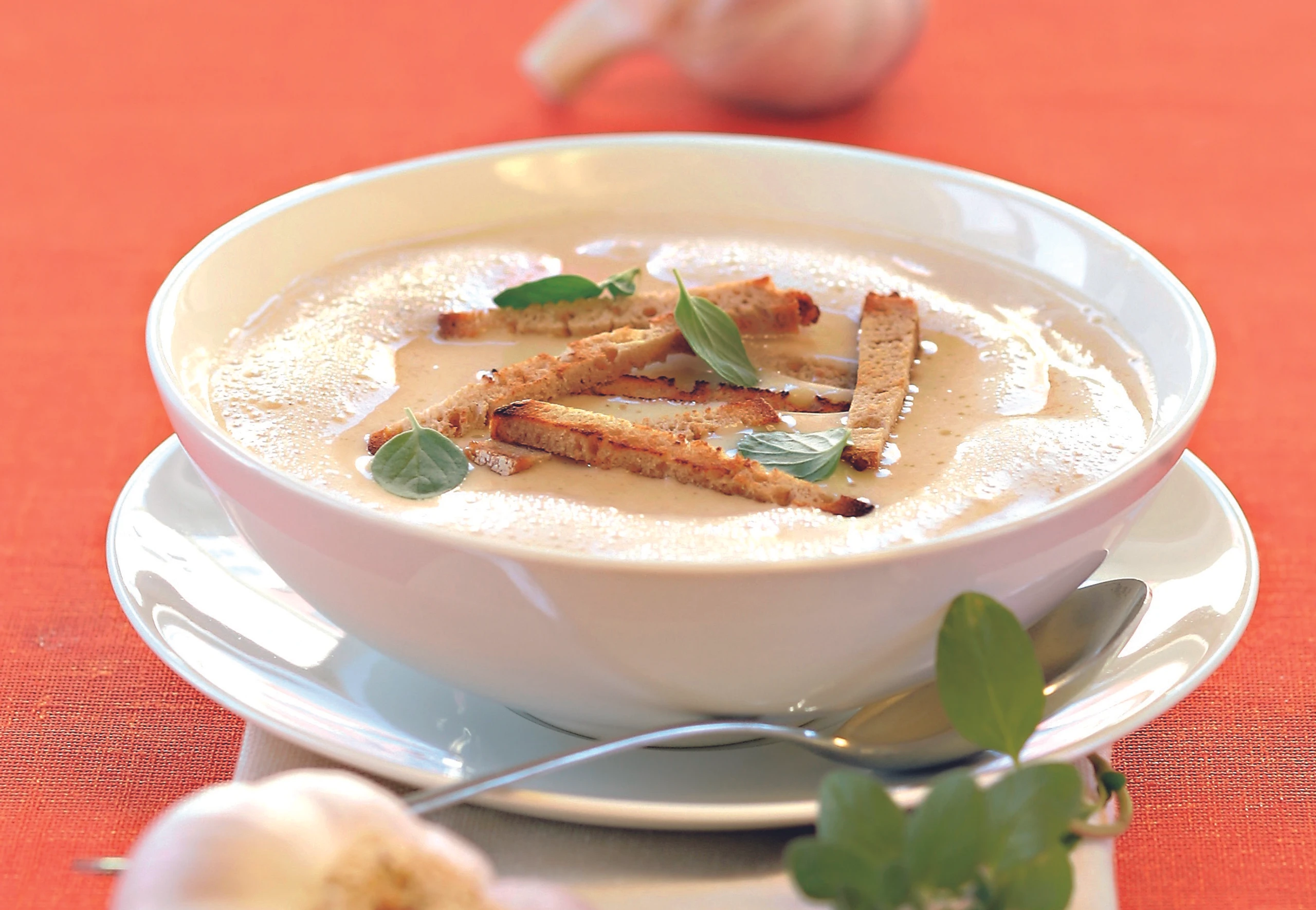Knoblauch und Zwiebel schälen, in kleine Stücke schneiden und in Butter oder Margarine anschwitzen. Stärke darüber streuen, zart bräunen und mit Wein ablöschen. Milch und Suppe unter Rühren zugießen. Suppe 20 Minuten ziehen lassen.
