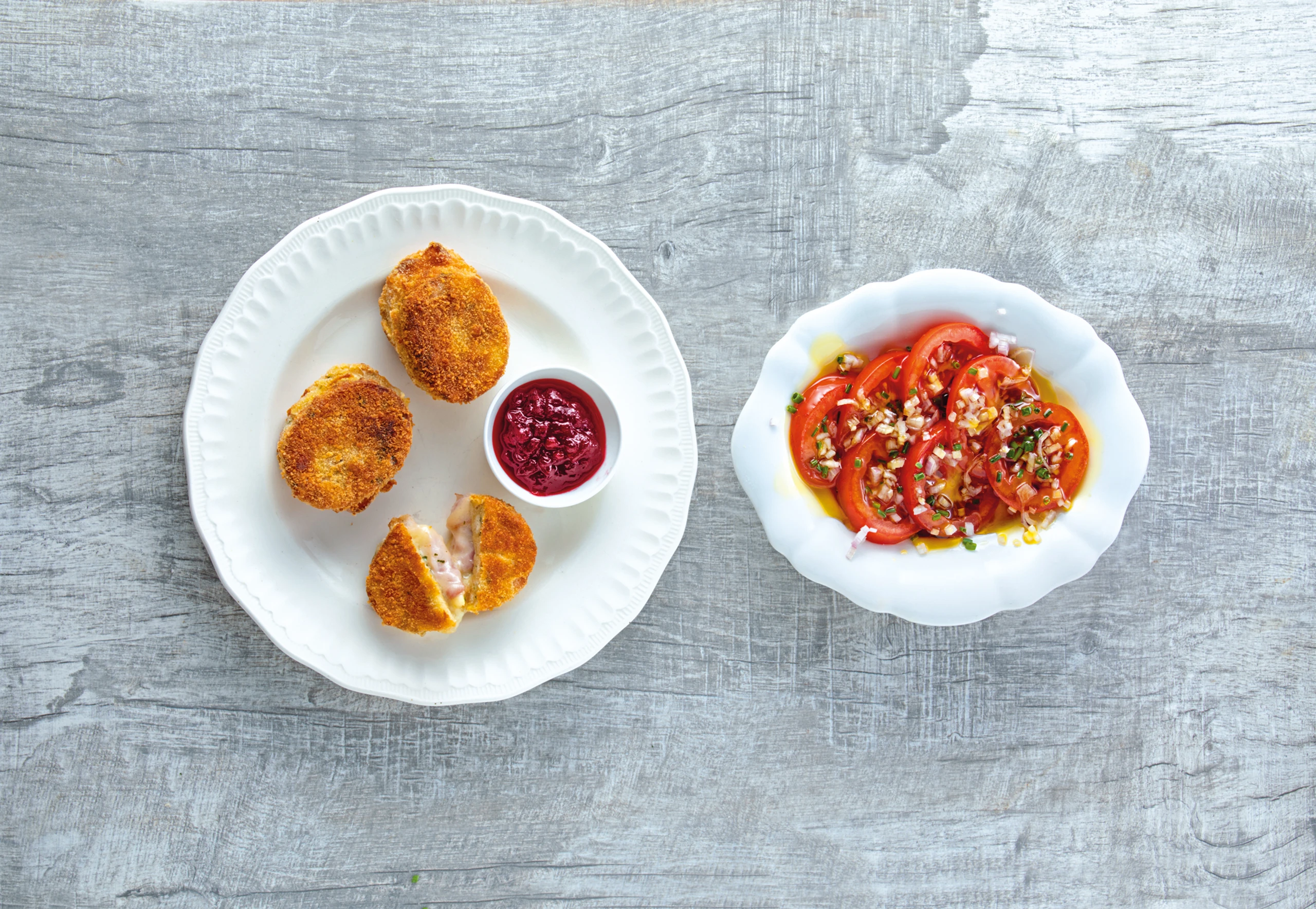 Knödel-Cordon-bleu mit Paradeissalat