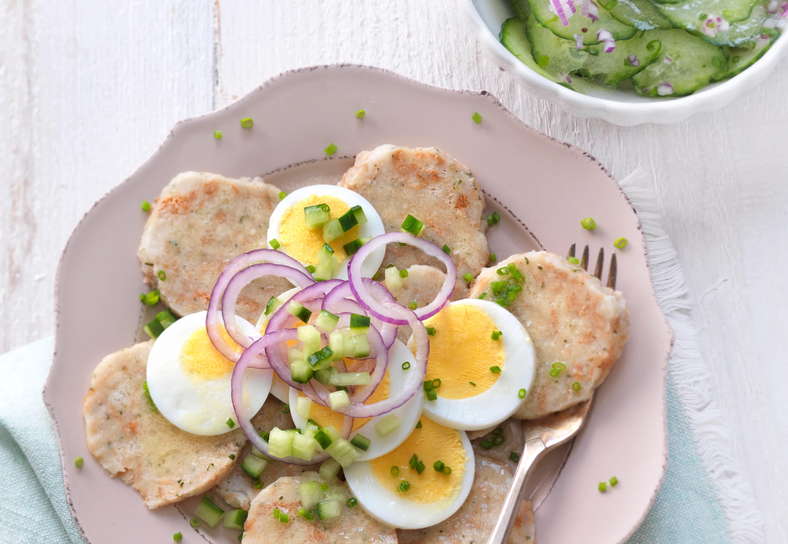 Knödel, Ei, und Zwiebelringe auf Tellern auflegen. Mit Gurkenwürfeln und Schnittlauch bestreuen und mit Dressing marinieren. Dazu passt ein Gurkensalat.