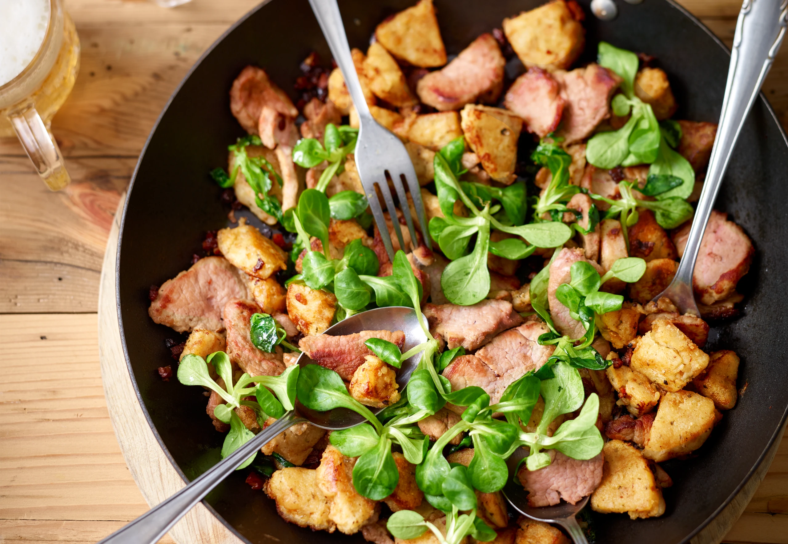 Knödelgröstl mit Schweinsfilet, Speck und Vogerlsalat