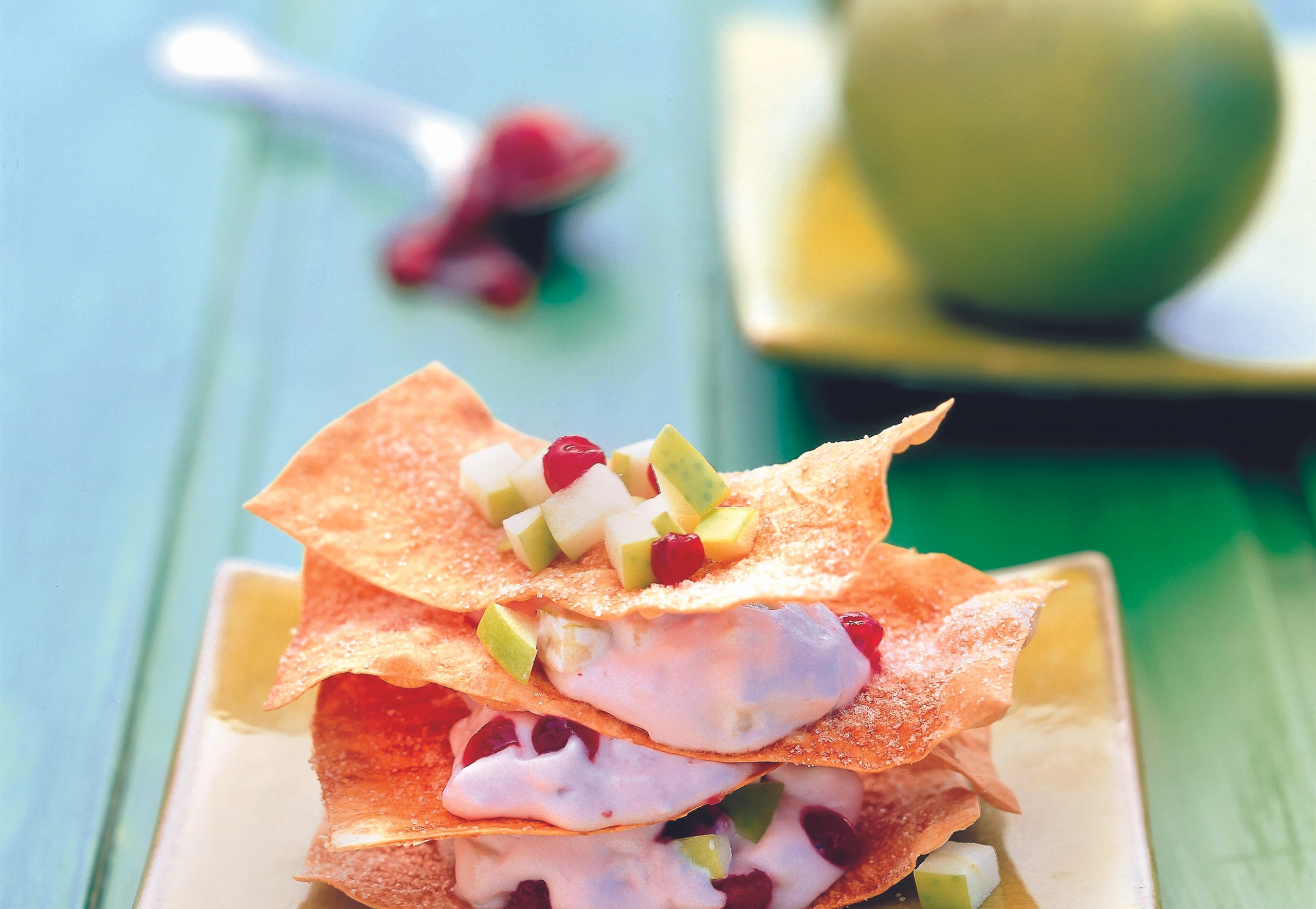 Strudelblätter abwechselnd mit der Creme zusammensetzten. Mit Apfelwürfeln und Ribiseln garnieren.