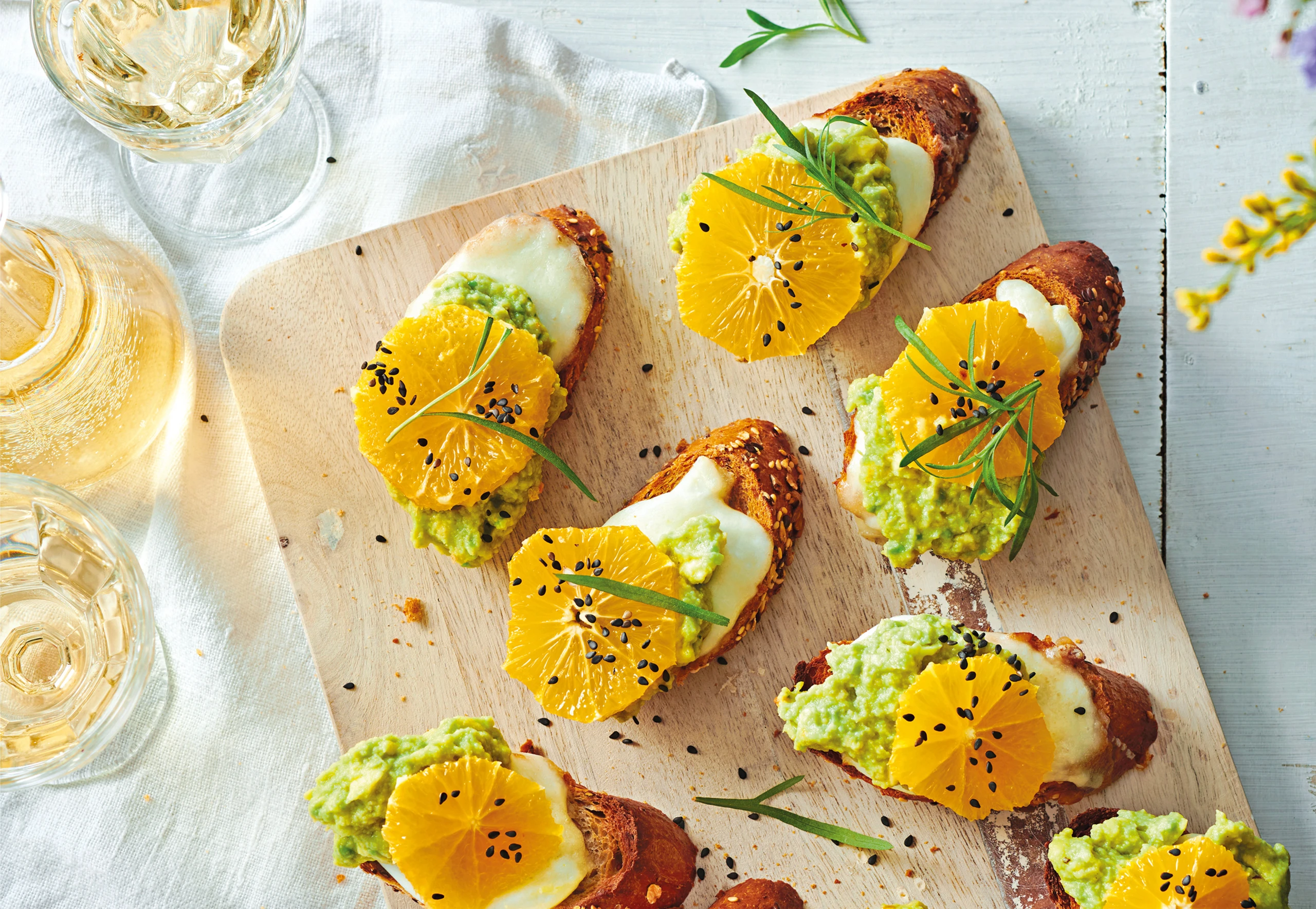 Brote herausnehmen, Avocadoaufstrich auf dem Mozzarella verteilen, mit Orangenscheiben belegen, mit Sesam bestreuen und mit Estragon garnieren.