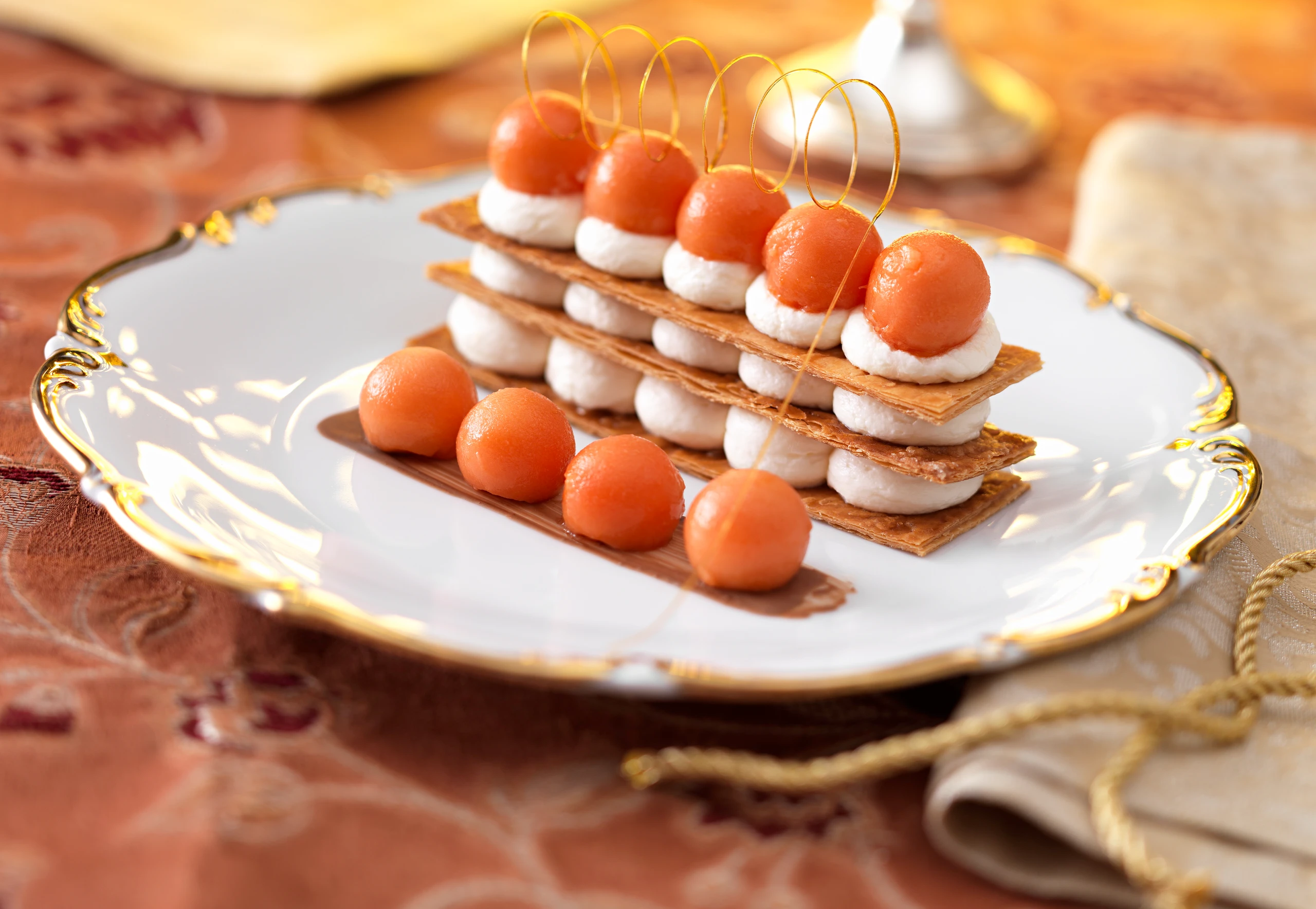 Cremezutaten aufschlagen und in einen Dressiersack mit Lochtülle (Ø 6 mm) füllen. Auf jeden Teigstreifen 5 Cremetupfer dressieren. Jeweils 3 Streifen übereinandersetzen, mit Papayas belegen. Schokolade auf die Teller streichen, Schnitten mit restlichen Papayas und Zuckerspiralen garniert servieren.