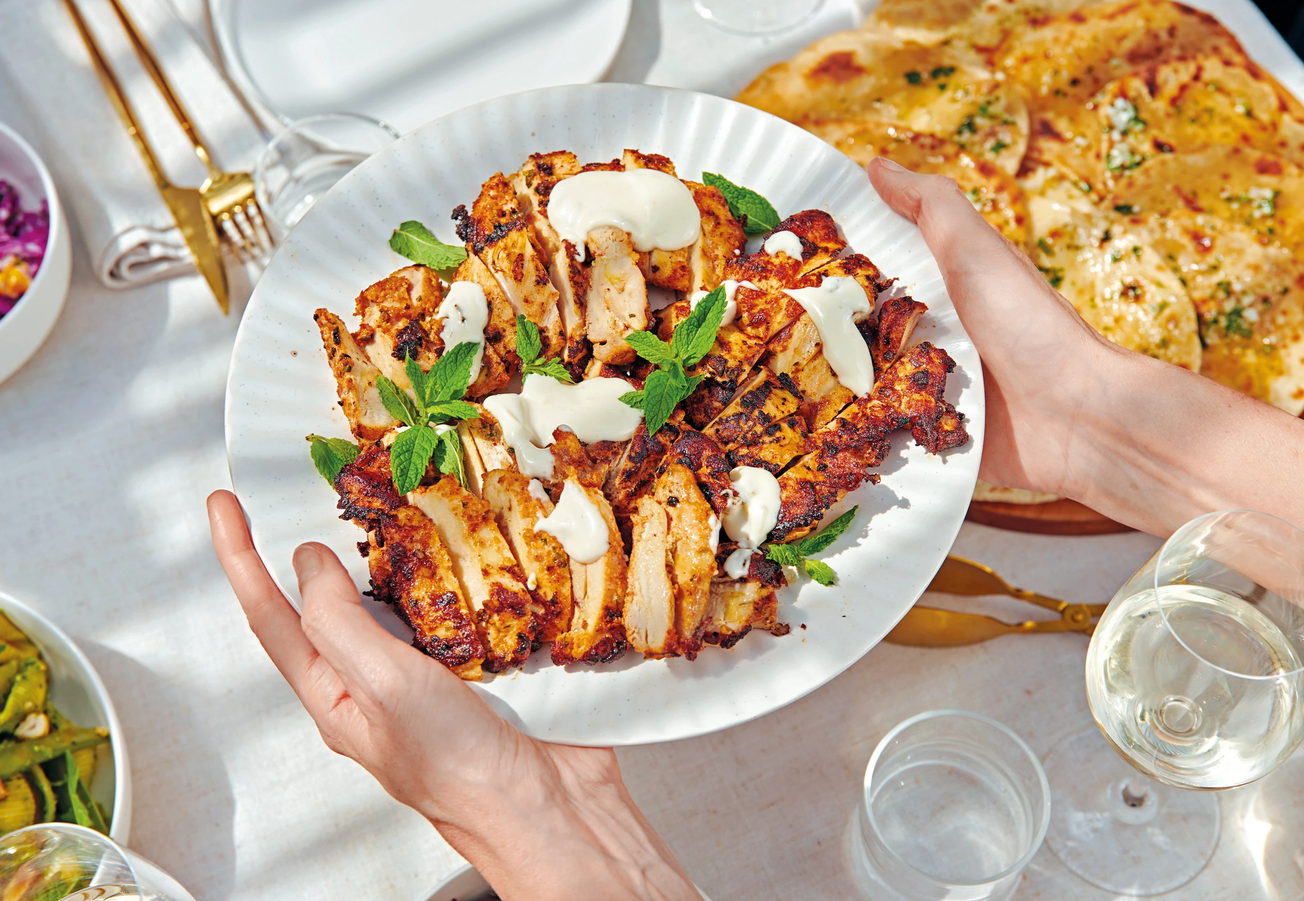 Huhn aus dem Rohr nehmen, aufschneiden und auf einem Teller anrichten. Mit der Mayonnaise beträufeln und mit Minze garnieren.