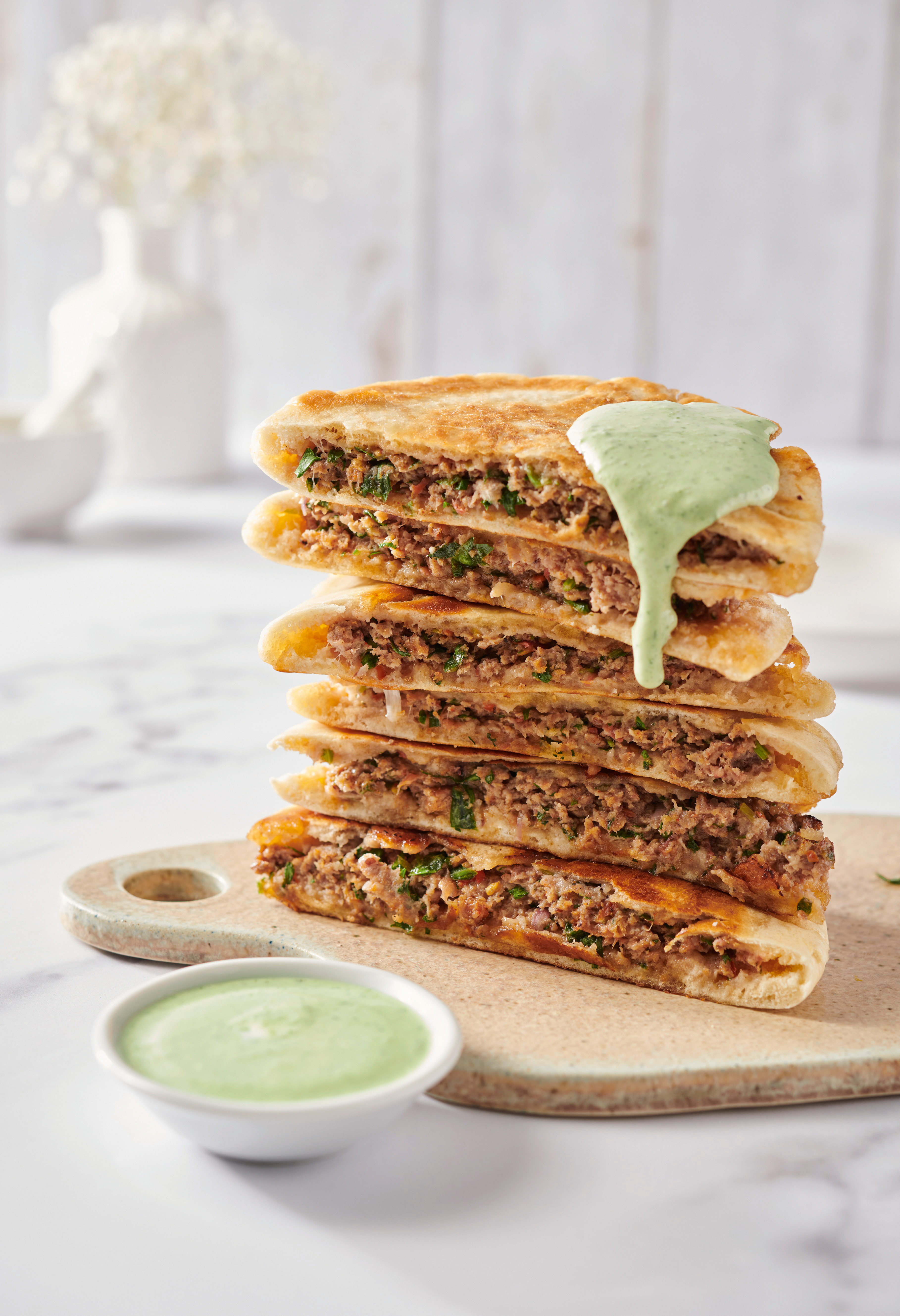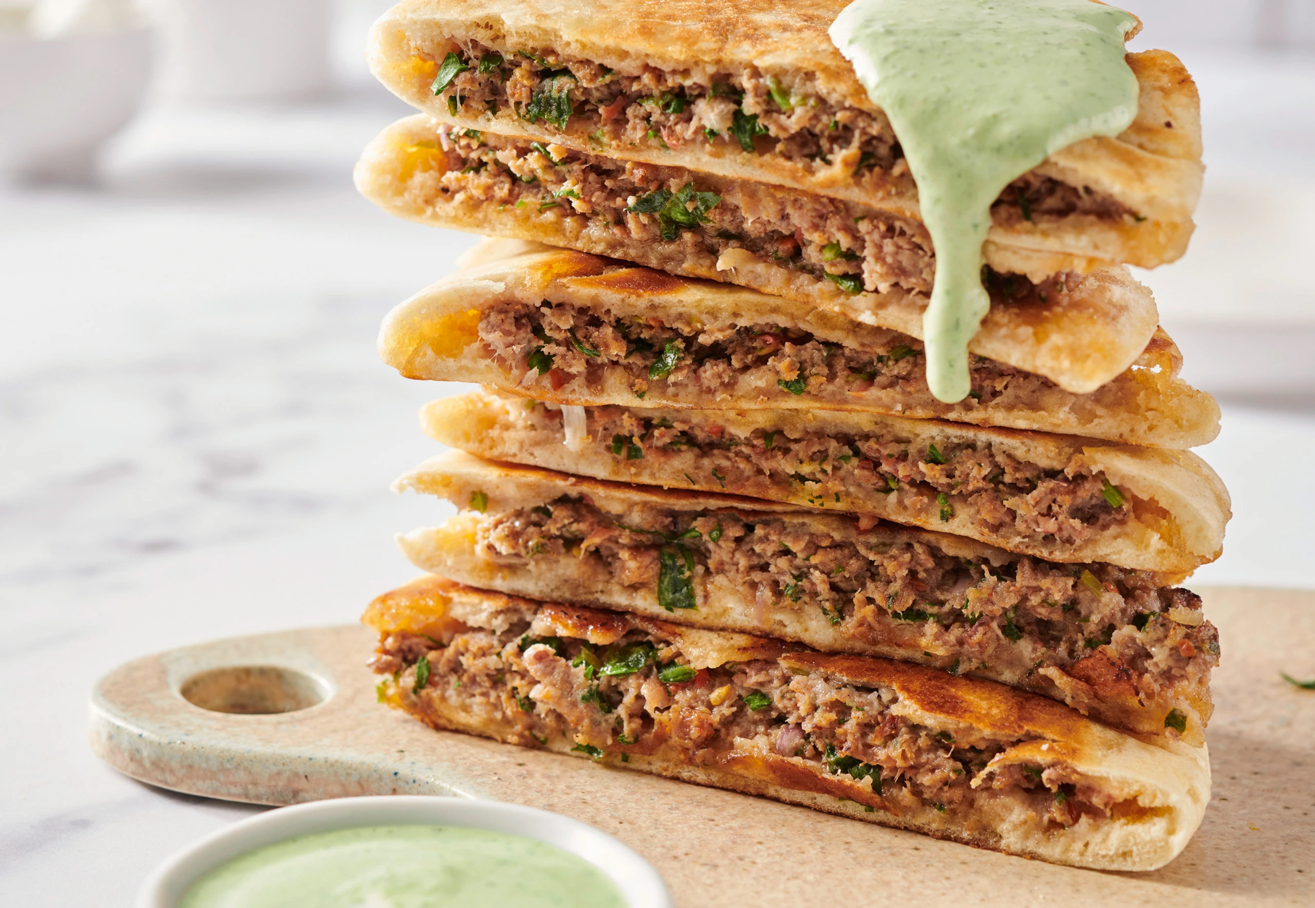 Pitabrote beidseitig mit Olivenöl bestreichen und in einer trockenen Pfanne goldbraun braten. Arayes mit dem Bärlauchdip heiß genießen.
