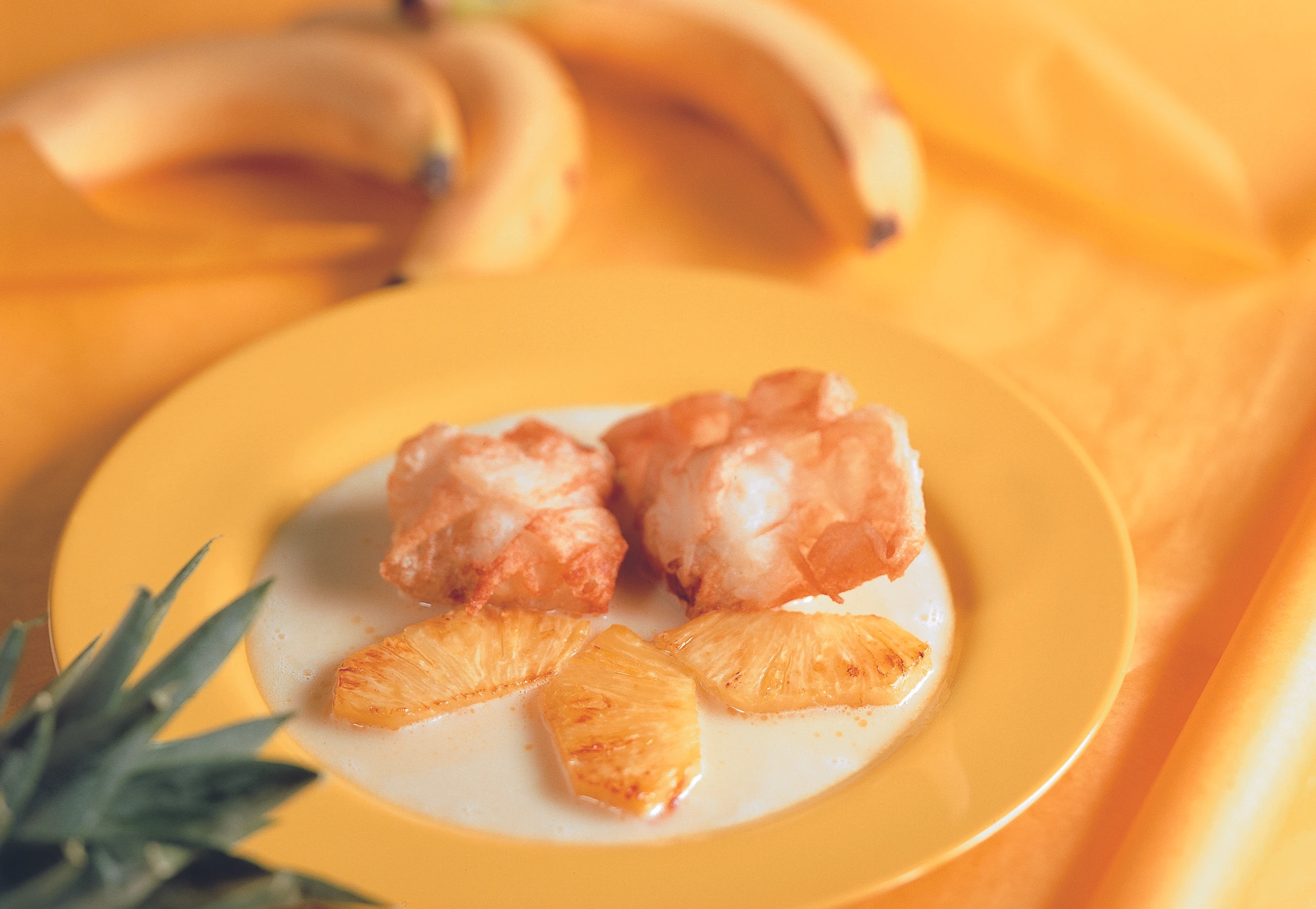 Ca. 3 Finger hoch Öl erhitzen, Krapferln darin goldgelb backen, mit einem Siebschöpfer herausheben, auf Küchenpapier gut abtropfen lassen, mit weißer Schokosauce und gebratenen Ananasstücken (siehe Rezepte) anrichten.
