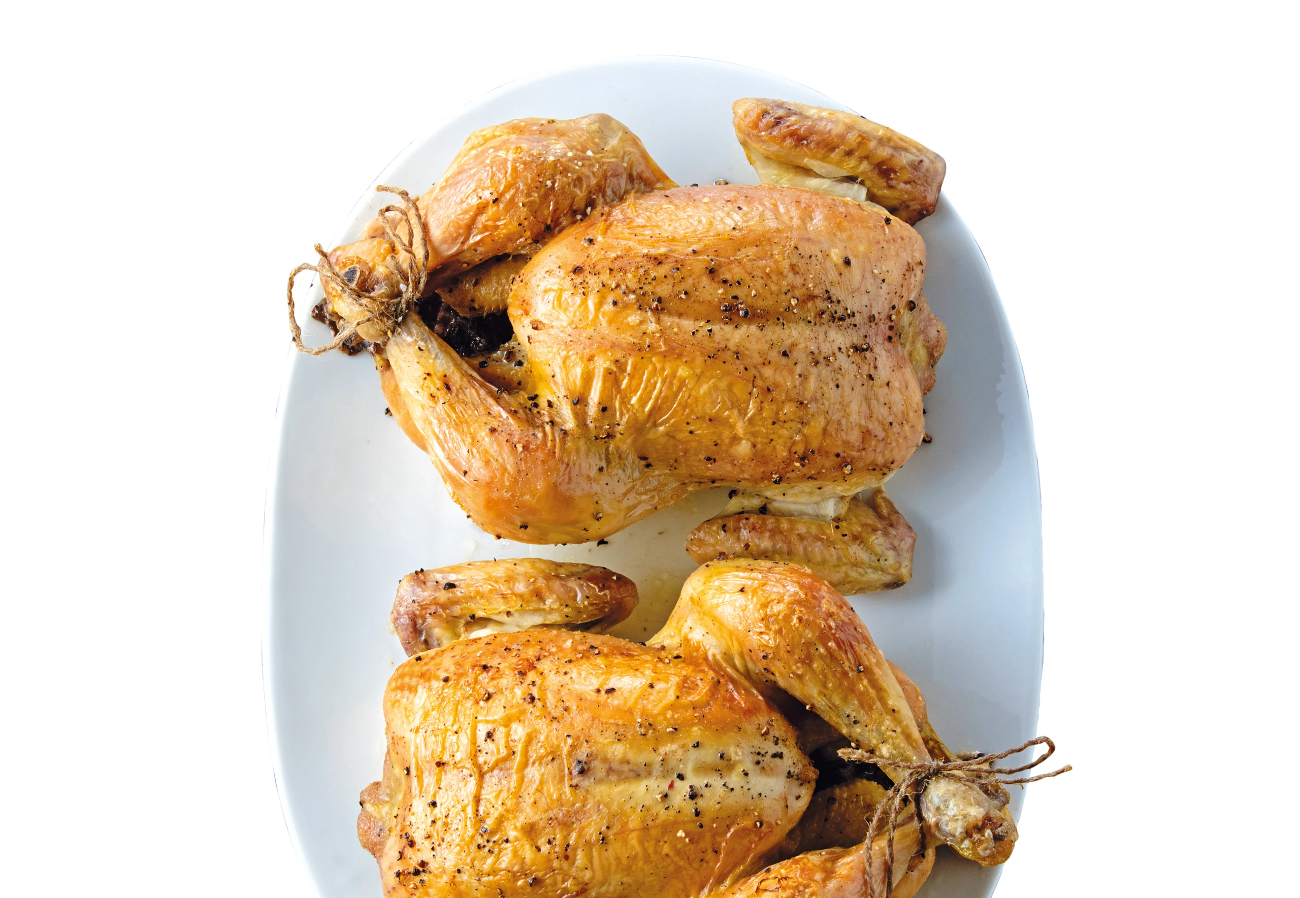 Rohr auf 170°C vorheizen. Hühner waschen, trockentupfen und mit Salz und Pfeffer kräftig würzen. Auf ein Blech legen und mit Wasser untergießen. Im Rohr (2. Schiene von unten) ca. 2 Stunden braten.