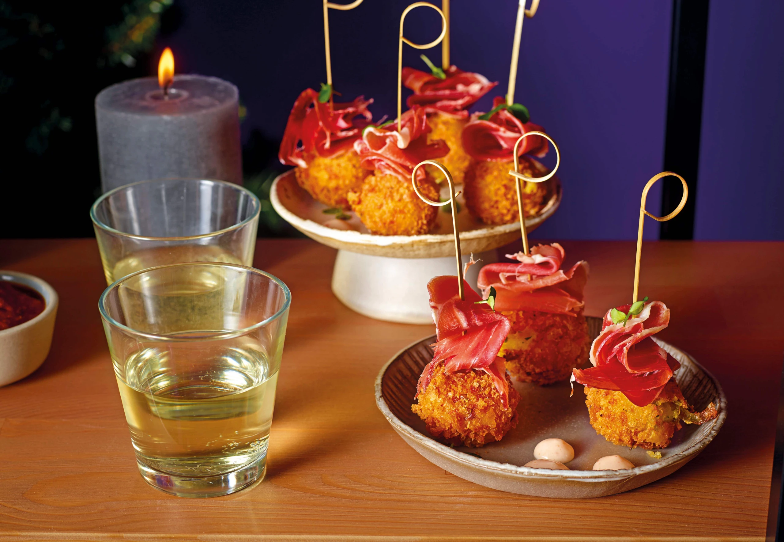 Knusprige Erdäpfel-Lauch-Bällchen mit Serrano