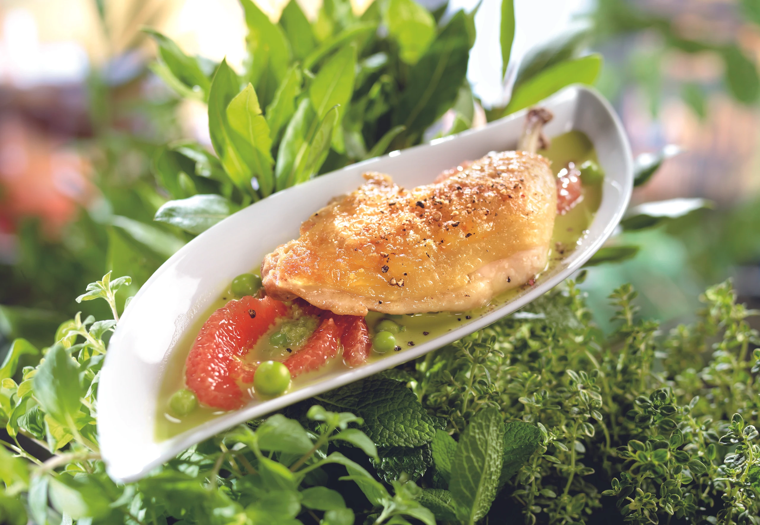 Knusprige Hühnerkeule mit Grapefruits und Erbsen
