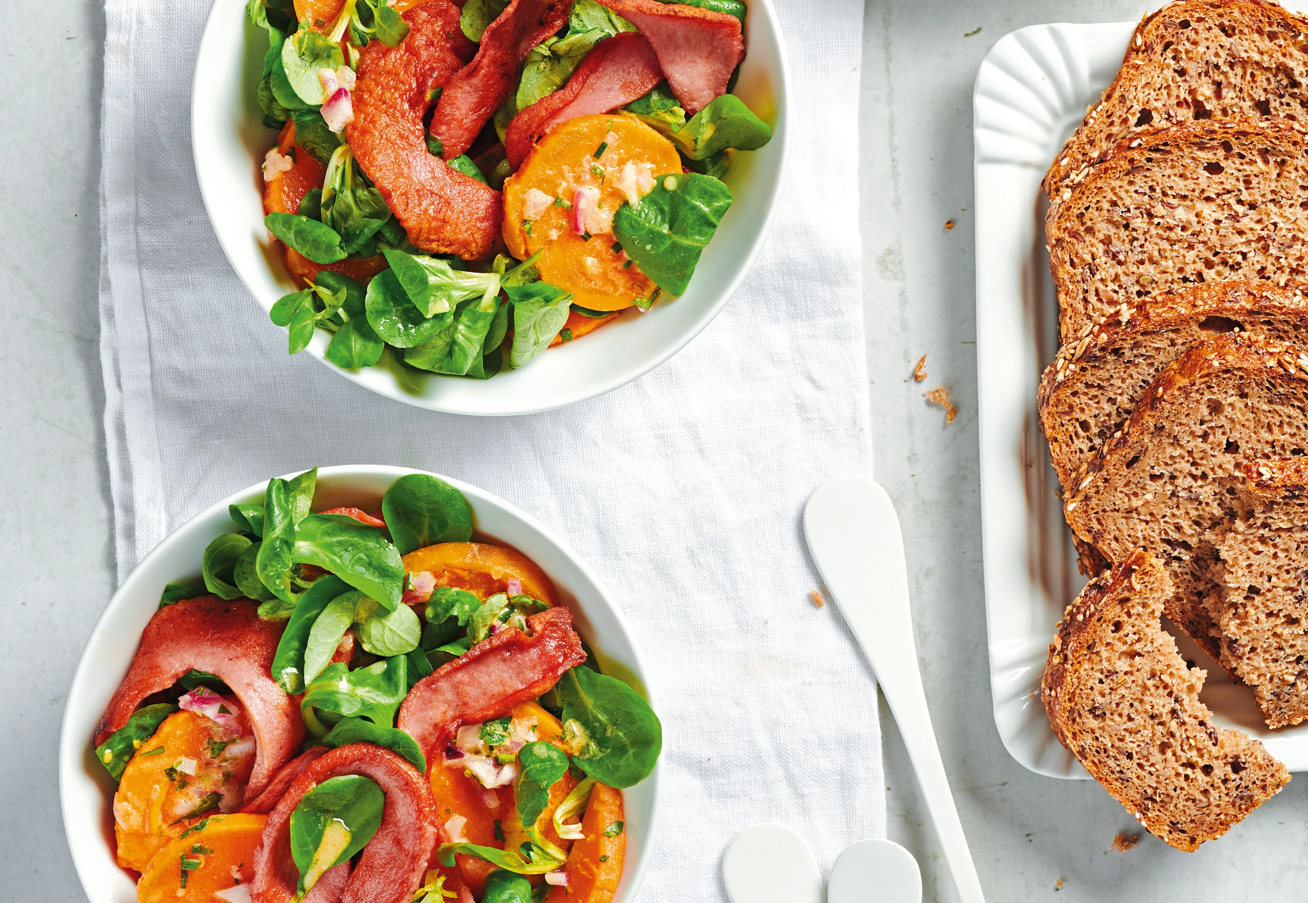 Knusprige Knackwurst auf Süßkartoffel-Vogerlsalat